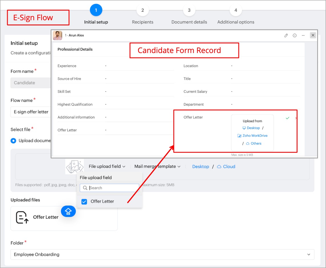 ワークフローの実行によって電子署名の処理を実行するには、Zoho SignとZoho Peopleの連携が必要です。