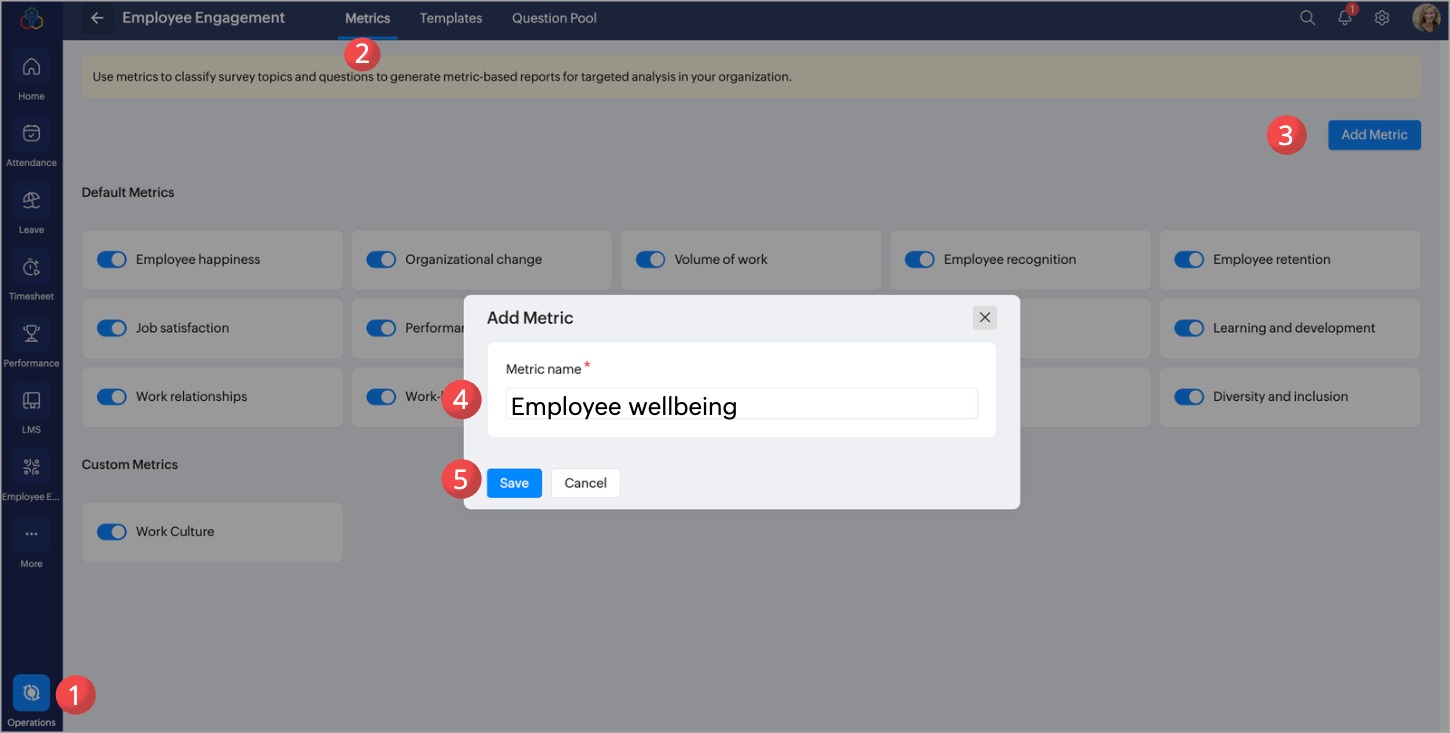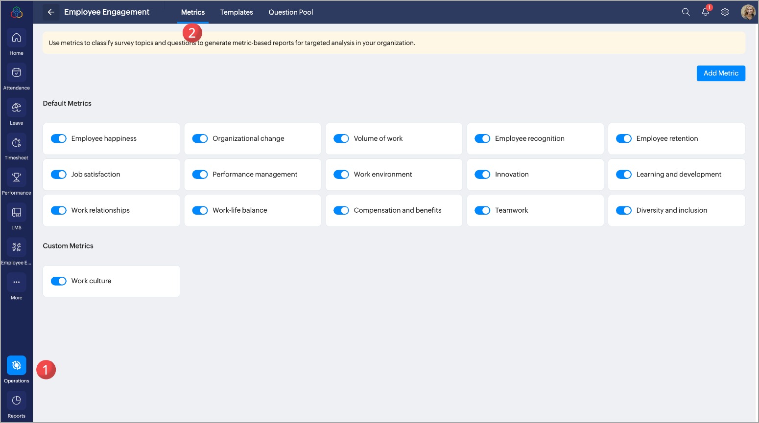 従業員エンゲージメントにおける操作では、メトリックを組み込み、アンケートテンプレートを考案し、質問プールに質問を含めることができます。これらはeNPSやエンゲージメント調査を作成する際に利用できます。