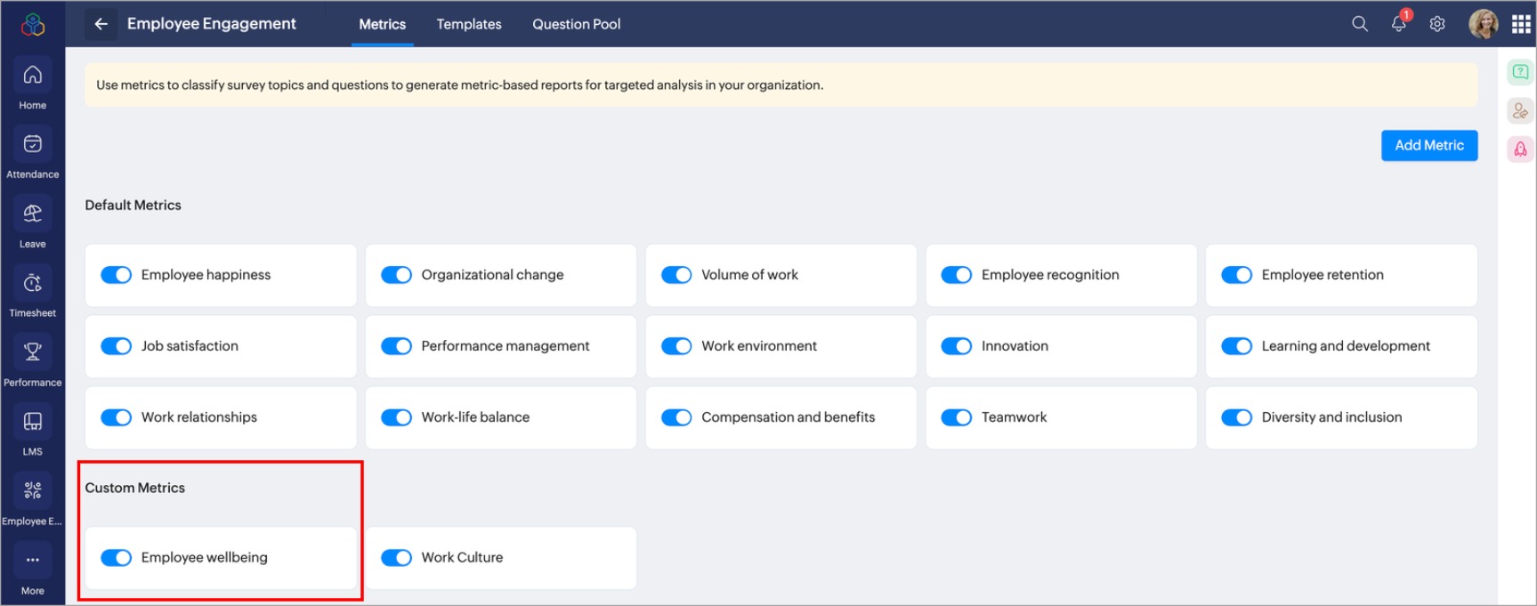 従業員エンゲージメントでは、メトリックスはアンケートの話題や質問を分類するカテゴリとして機能します。メトリックスはアンケートの質問に関連付けられ、メトリックスに基づいてアンケートを表示するために使用できます。Zoho Peopleは画像に示された初期設定のメトリックスを提供し、また、独自のカスタムメトリックスを作成するオプションもあります。