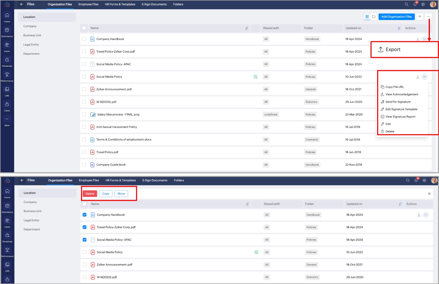 ドロップダウンから[受取確認済み]または[保留中]を選択して、従業員の受取確認のステータスを確認できます。さらに、受取確認のレポートをエクスポートすることもできます。