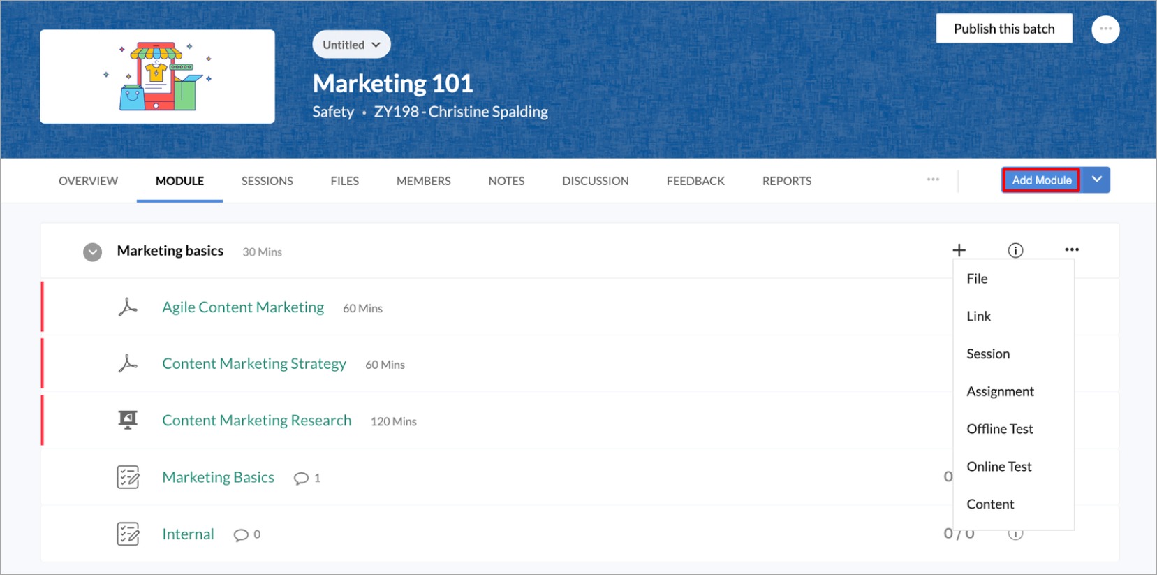 4. [+]アイコンをクリックすると、関連ファイル、リンク、講義、課題、テストなどを追加できます。コースにアップロードされたすべてのファイルは、[ファイル] タブで表示できます。