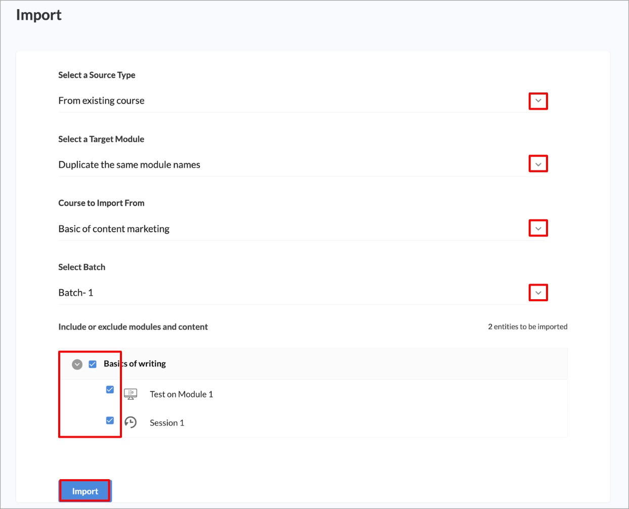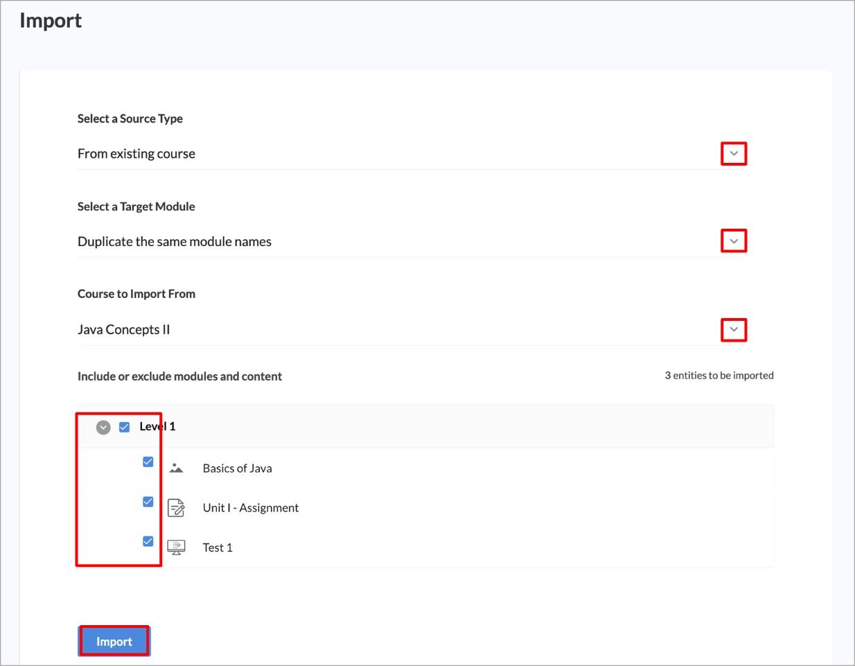 7. チェックボックスを使用して、インポートする単元と内容を選択します。