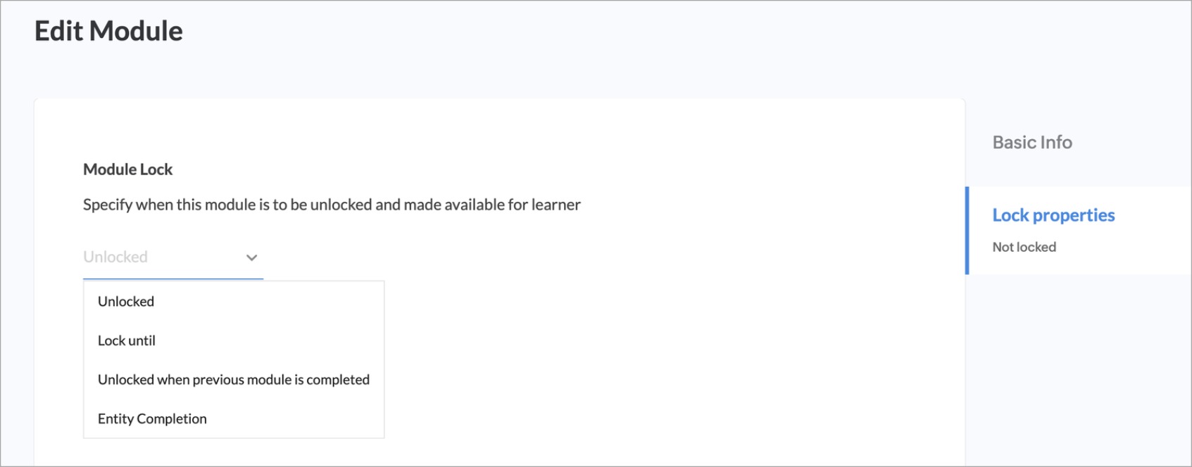 4. 単元のロックを設定します。これにより、特定の日付または指定したコースの項目が完了するまで単元をロックできます。ロックしない場合は、[ロック解除済み]を選択してください。