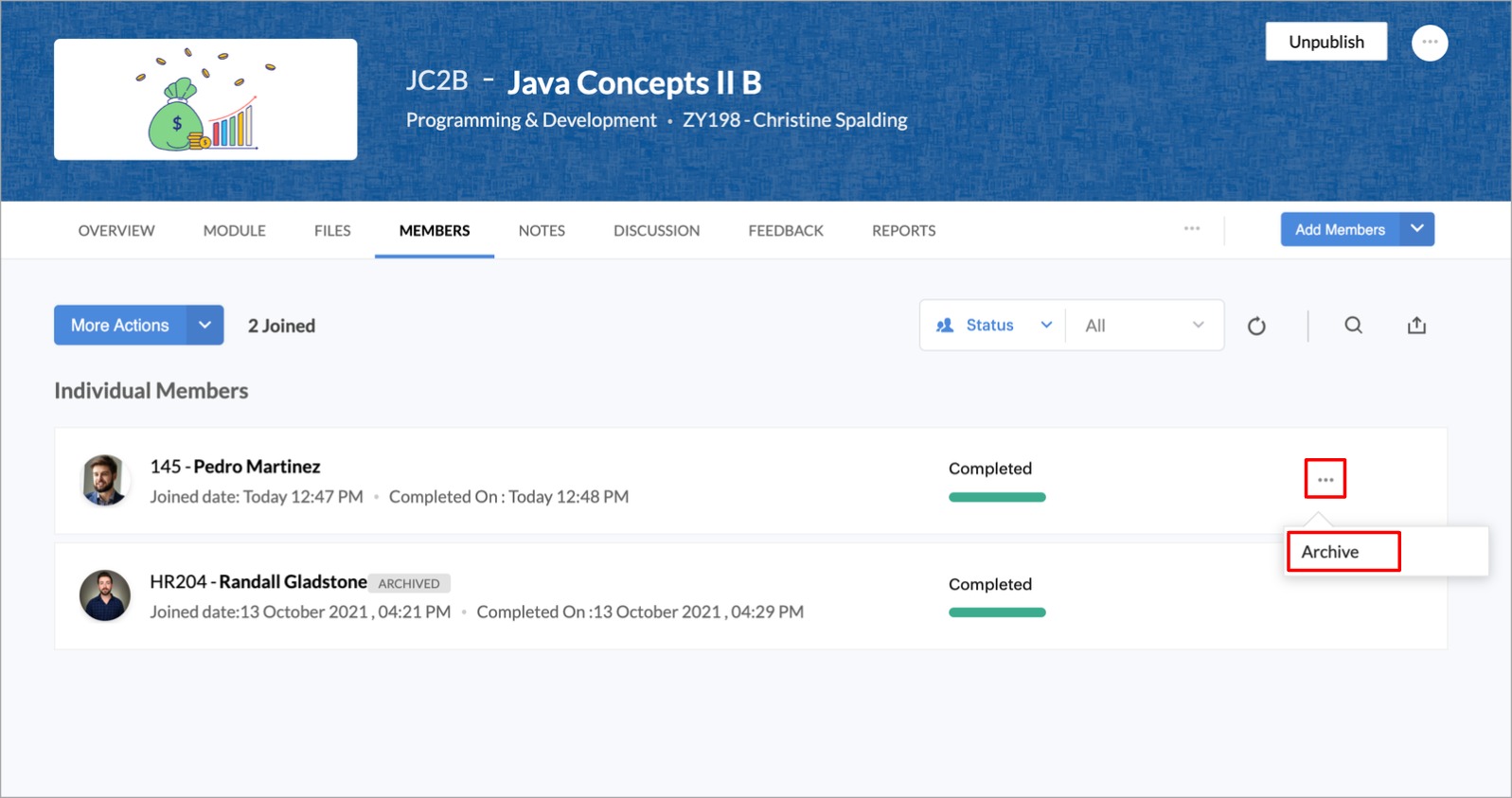 2. アーカイブ済みメンバーの受講者データは最終的なものとなり、変更できなくなります。アーカイブ済みメンバーを登録解除することはできません。