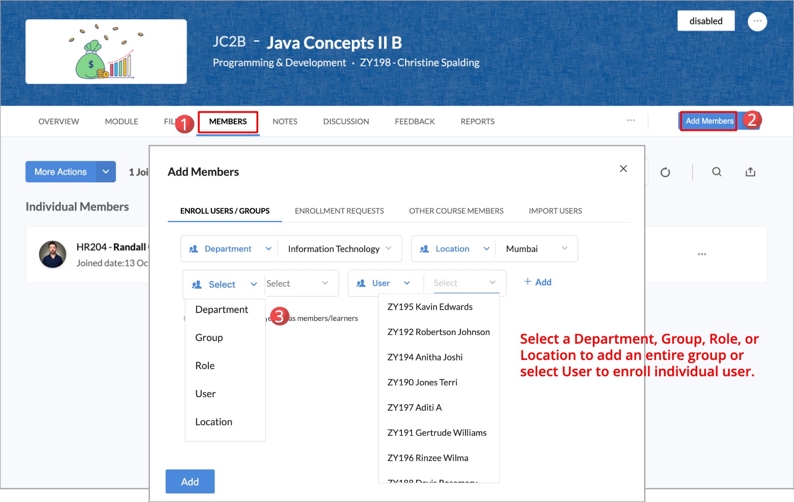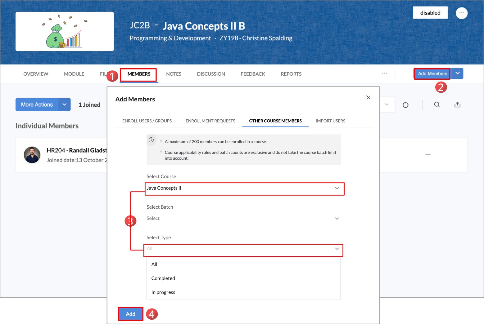 2. [メンバー]→[メンバーを追加する]→[他のコースメンバー]の順に移動します。