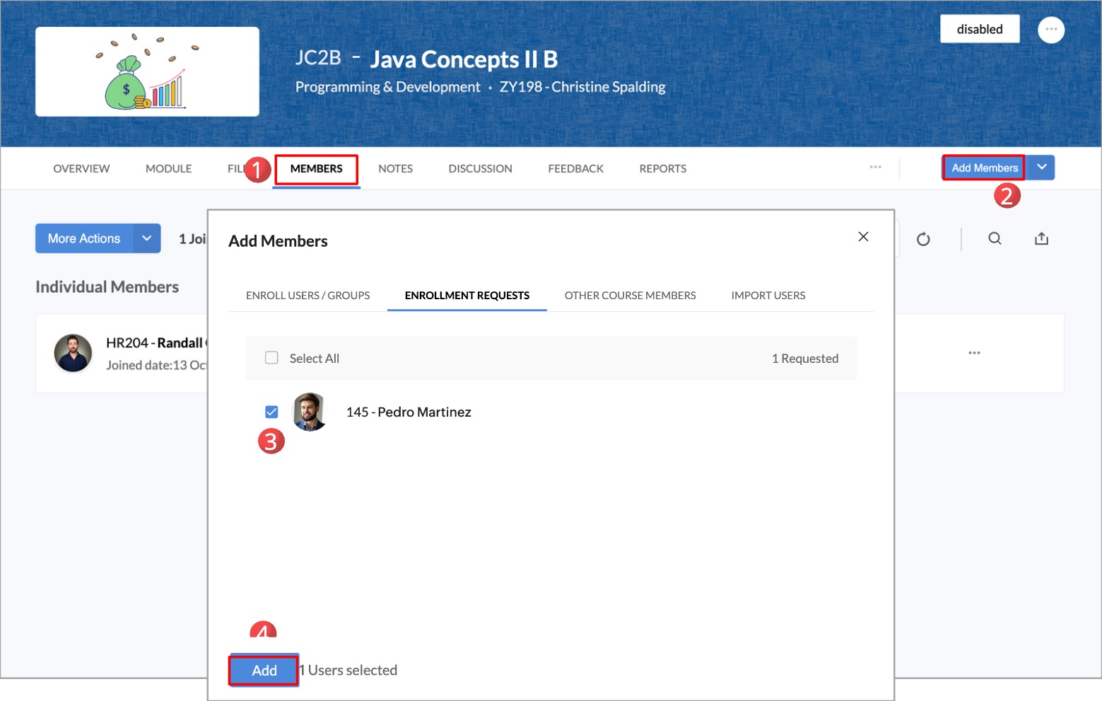 1. 任意のコースを開き、[メンバー]タブへ移動します。