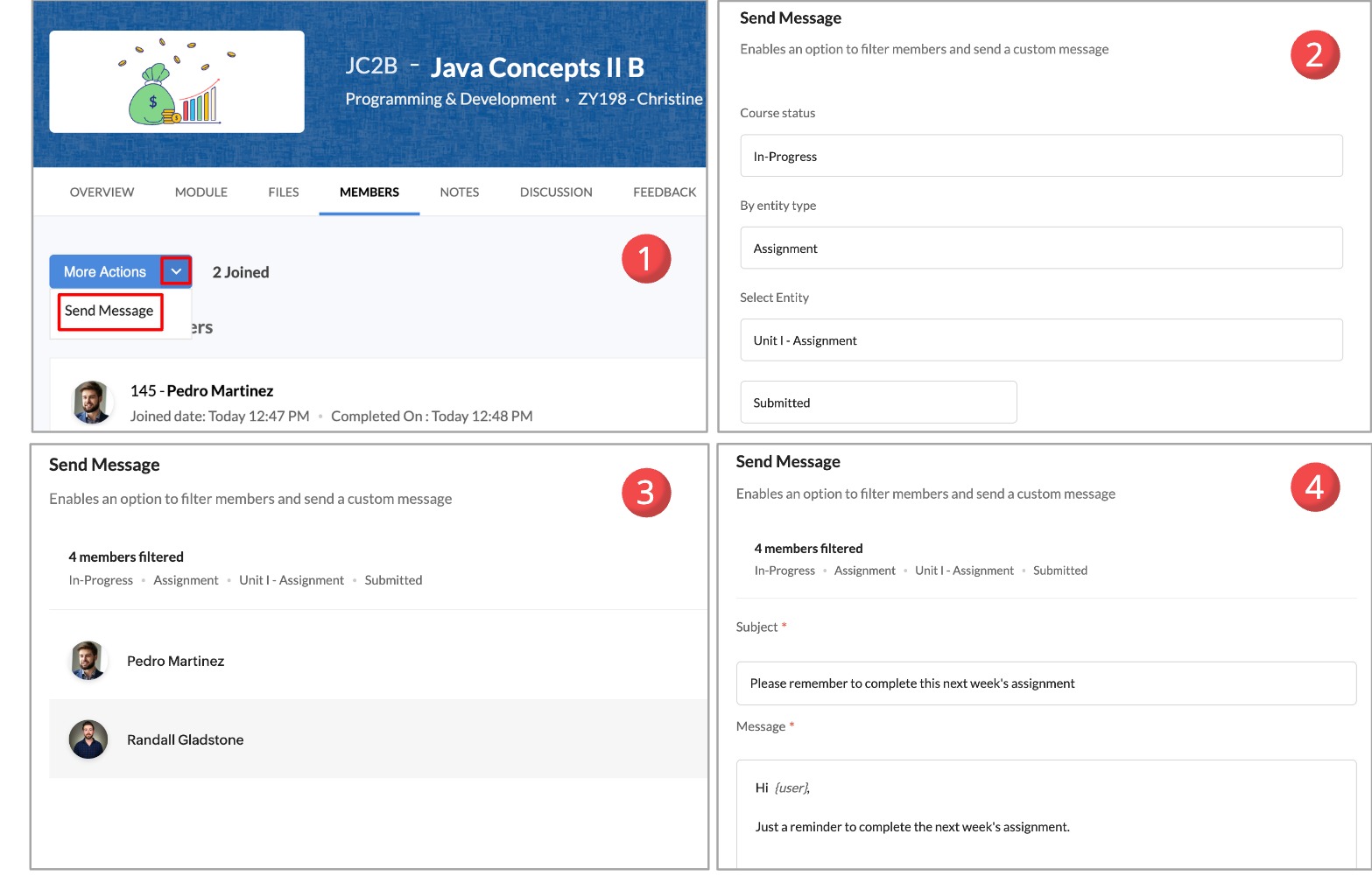 1. メッセージを送信するには、メンバーが追加されている任意のコースを開いて、[その他の操作]→[メッセージの送信]の順に移動します。