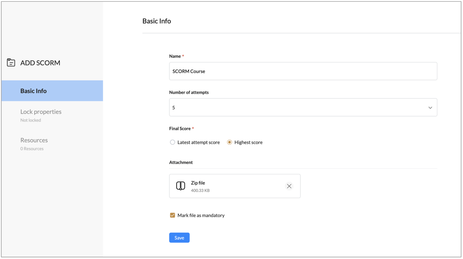SCORMとは、共有可能なコンテンツオブジェクト参照モデル(Sharable Content Object Reference Model)の略称です。Zoho Peopleでは、SCORMにより、文書、動画、クイズなどのeラーニング資料を標準化された形式でアップロードし、配布することができます。SCORMに準拠したコースは単一のZIPファイルにパッケージ化され、コースの作成の際に使用されたオーサリングツールに関わらず、Zoho PeopleのLMSに直接アップロード可能です。相互運用性を確保することで、異なるシステム間でトレーニング資料を容易に共有、再利用、管理することが可能になります。SCORM形式でコースを作成すると、LMS内にアップロードして再利用することができるため、新しいLMSコースを一から作成する必要はありません。また、受講者がコースを完了するまでに要した時間や、受講者の学習成果を把握するうえでも役立ちます。