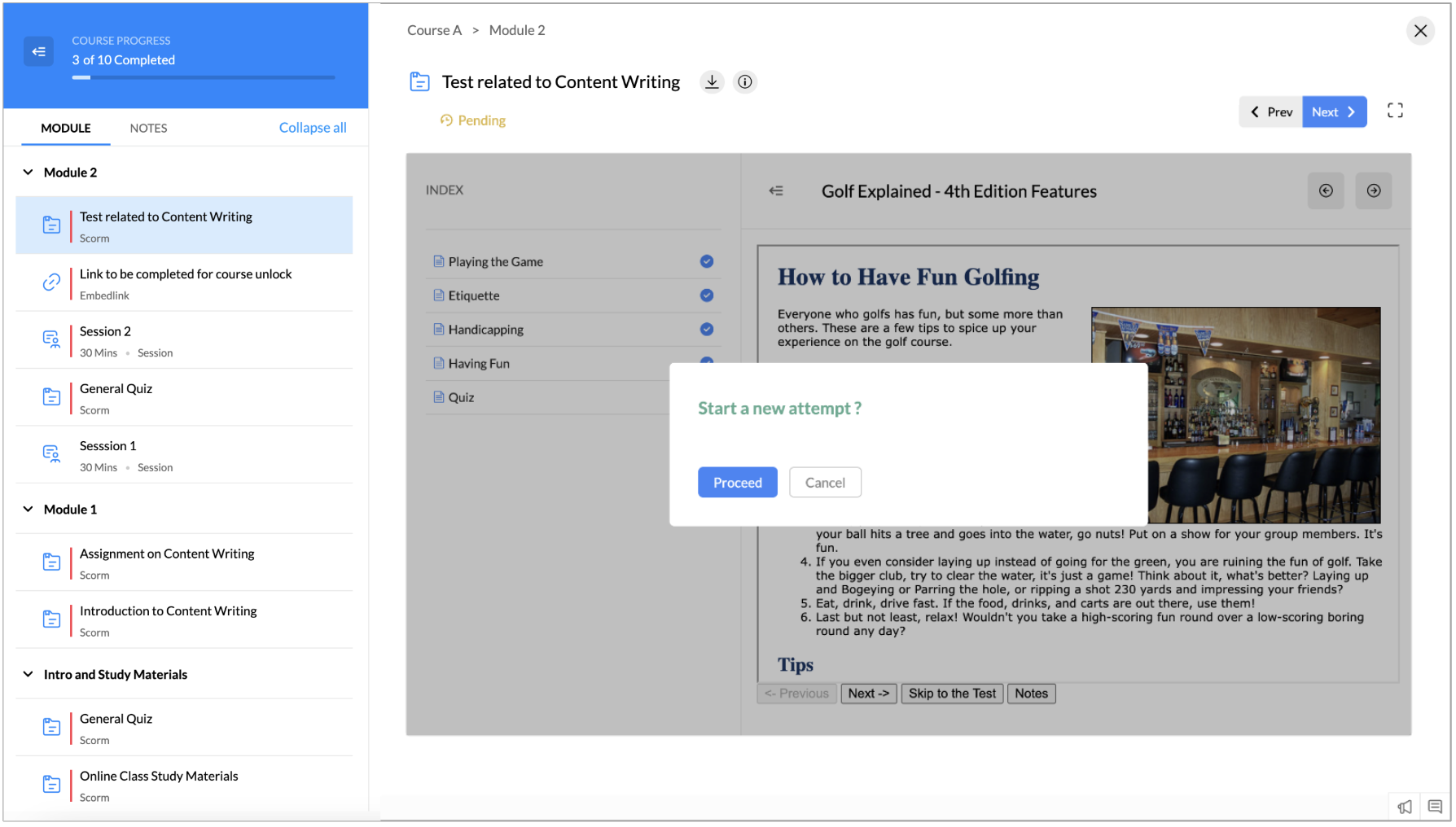 4. 受験回数の上限が10回に設定されており、ユーザーが受験に1回失敗した場合、受講者がその単元からファイルを再開すると、ポップアップが表示されます。コースを再受講するには、[続ける]を選択し、コースを完了してください。