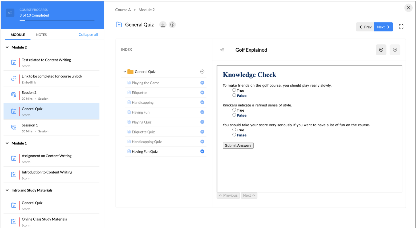 3. SCORMファイルを開くと、以下のスクリーンショットのように、コースのプレビューが表示されます。