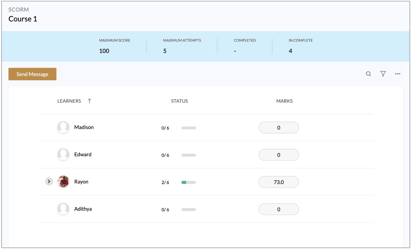 8. コース管理者は、各単元の完了状況を確認することで、受講状況を管理できます。必要に応じて、受講者に対して単元の要素を完了済みとしてマークすることもできます。