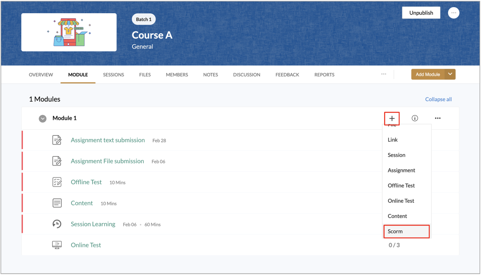 3. SCORMコースを追加するには、単元内で[+]アイコンをクリックし、[Scorm]を選択します。