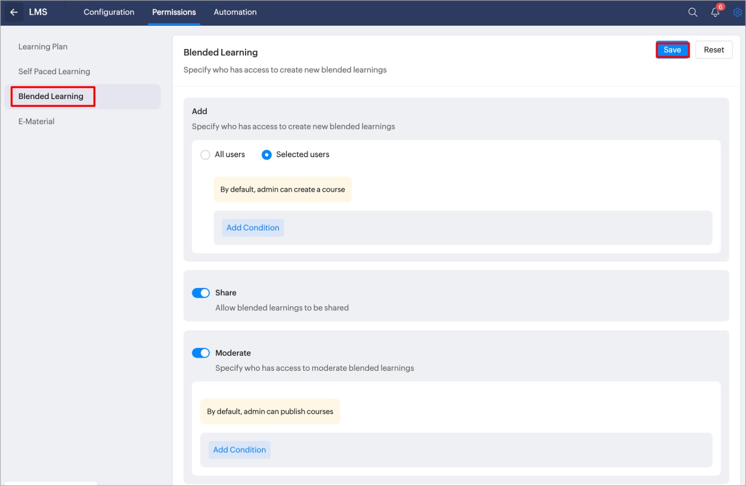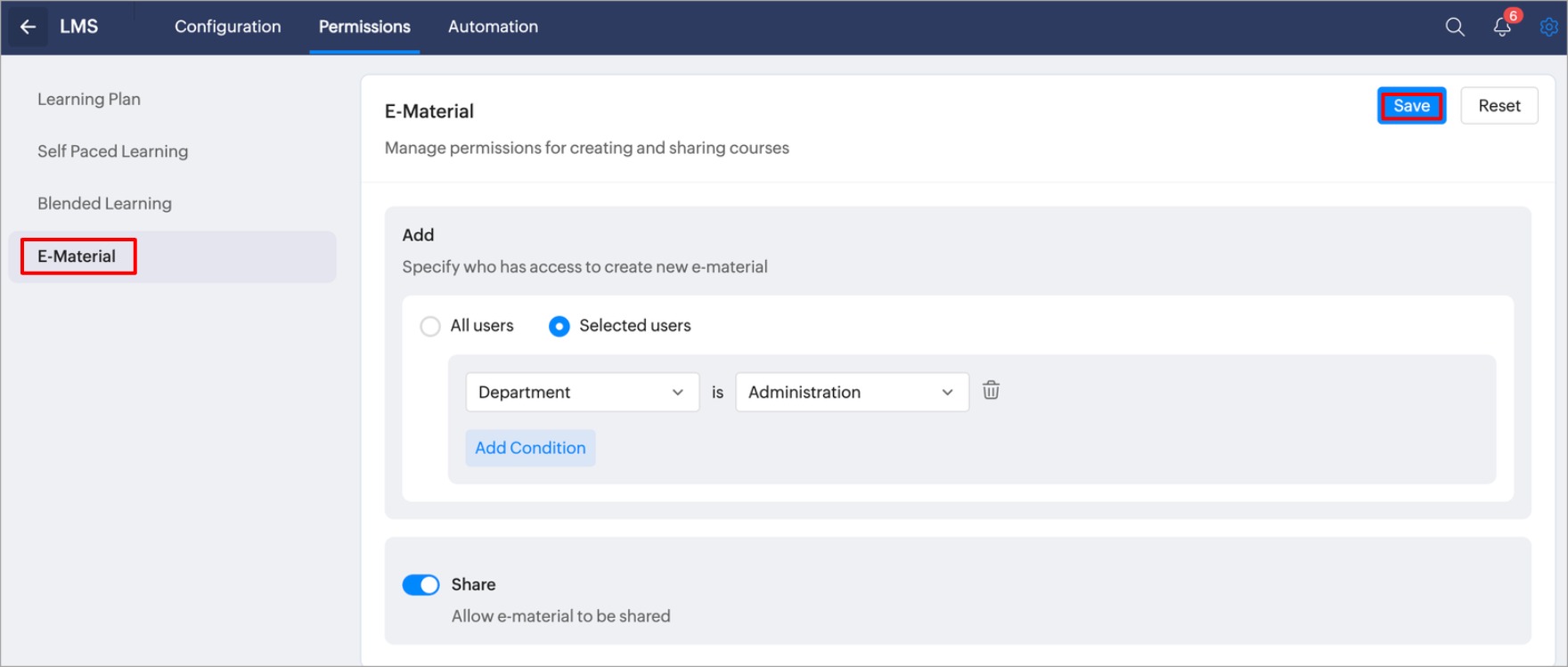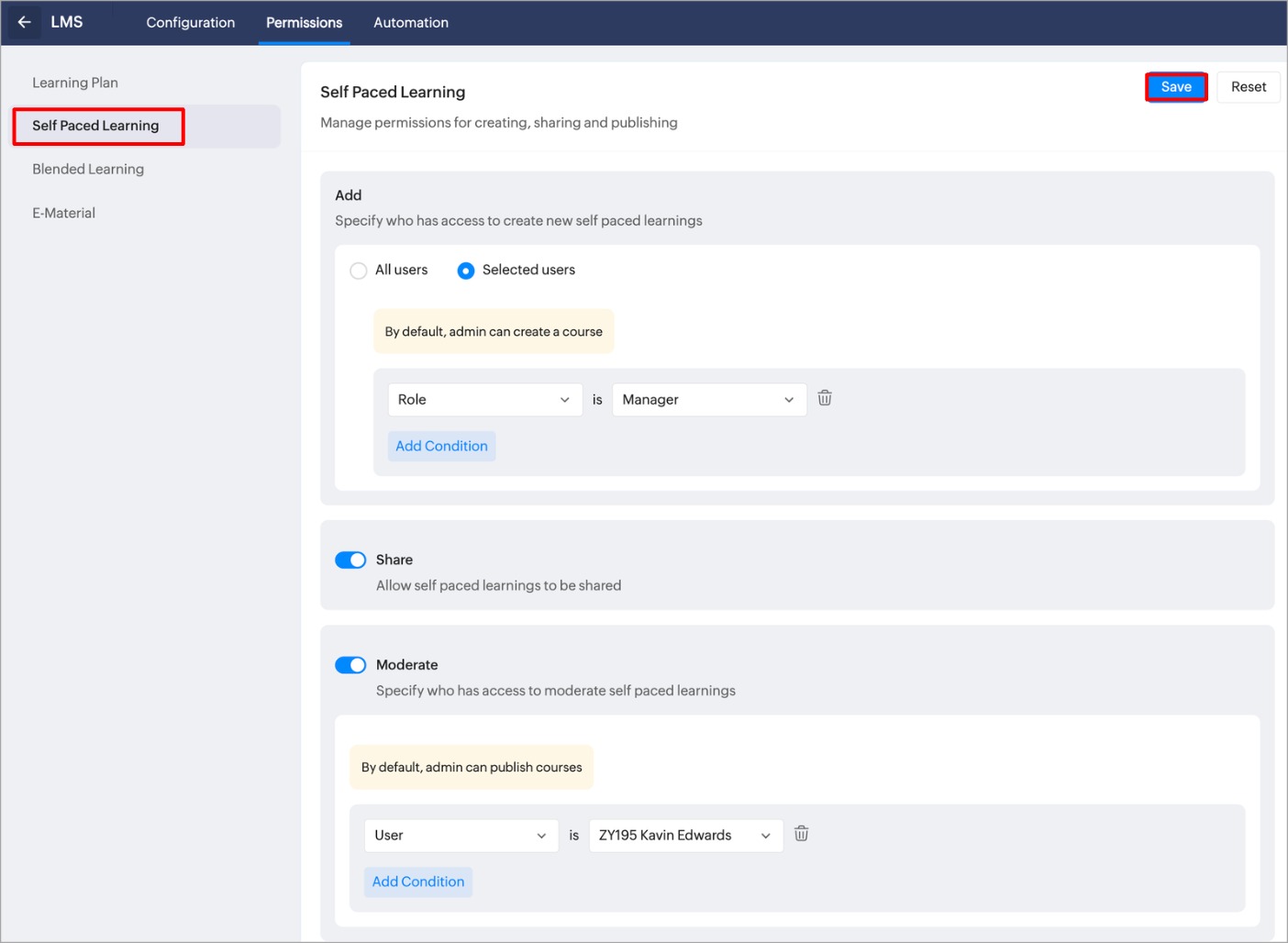 また、コースの共有/公開の権限についても管理できます。公開の権限が有効に設定されている場合、講師または管理者は公開前に公開申請を承認する必要があります。