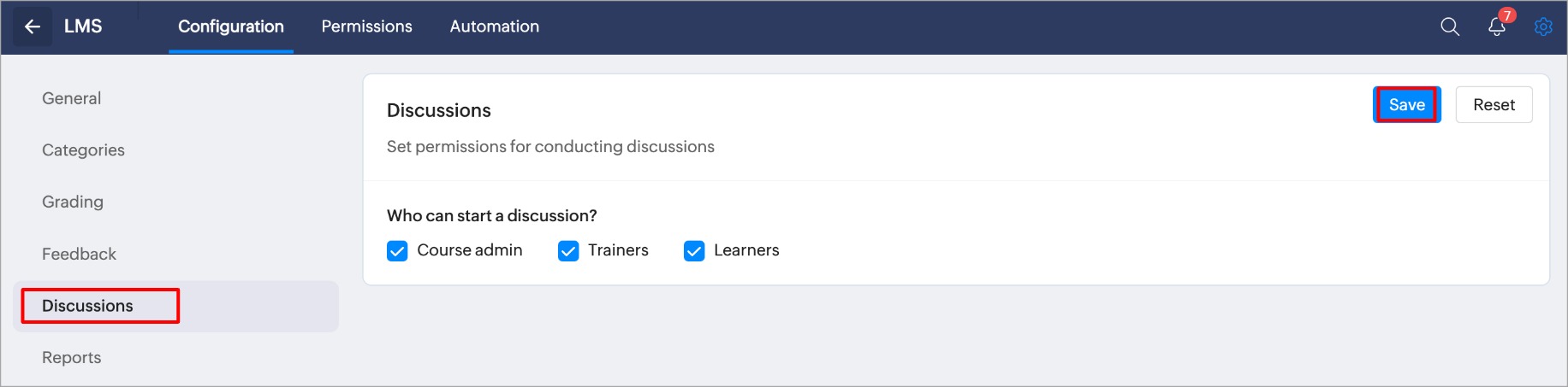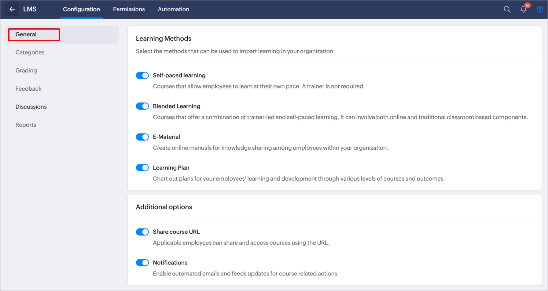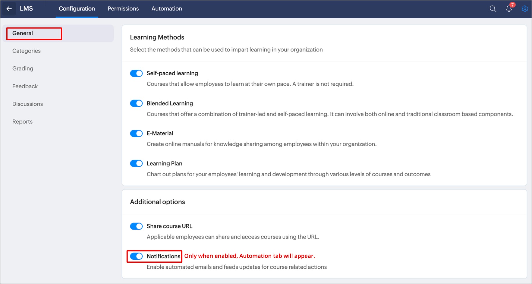 通知を有効にするには、[設定]→[LMS]→[設定]→[一般]の順に移動します。次に、[詳細設定]で[通知]を有効にした後、[保存する]をクリックします。