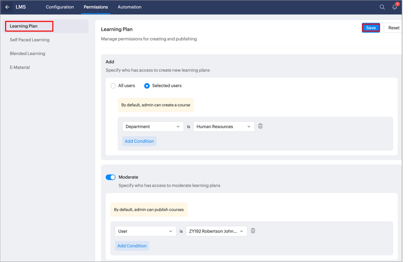 [権限]では、コースと学習計画の管理に必要な権限を一元管理できます。学習計画や個人学習の作成、共有、承認に関する権限を設定することが可能です。