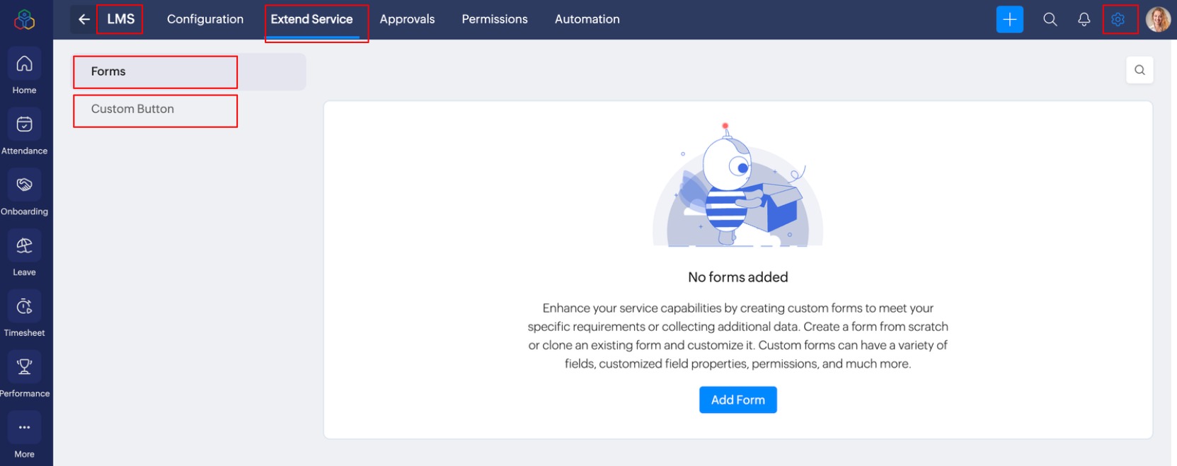 学習管理サービス設定内の[拡張機能]タブでは、サービス用の独自フォームを作成し、作成したフォームを組織固有のニーズに基づいて設定することができます。トレーニング推奨フォーム、ワークショップ申し込みフォームなど、学習管理関連のフォームを作成できます。また、これらのフォームに独自のボタンを追加したり、一覧やデータビューに独自のボタンを配置したりすることで、自動処理を実行できます(例:ワークフローの実行など)。自動処理には、メール通知、項目の更新、チェックリスト、独自の関数、電子署名フローなどが含まれます。