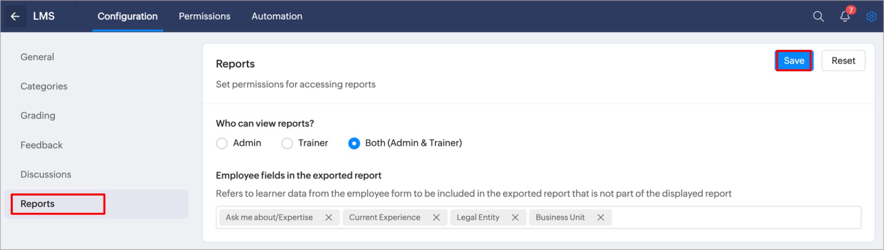 レポートを表示できるユーザー:管理者または講師のみがレポートを表示できるようにする場合は、[管理者]または[講師]を選択します。管理者と講師の両方がレポートを表示できるようにする場合は、[両方](管理者と講師)を選択します。
