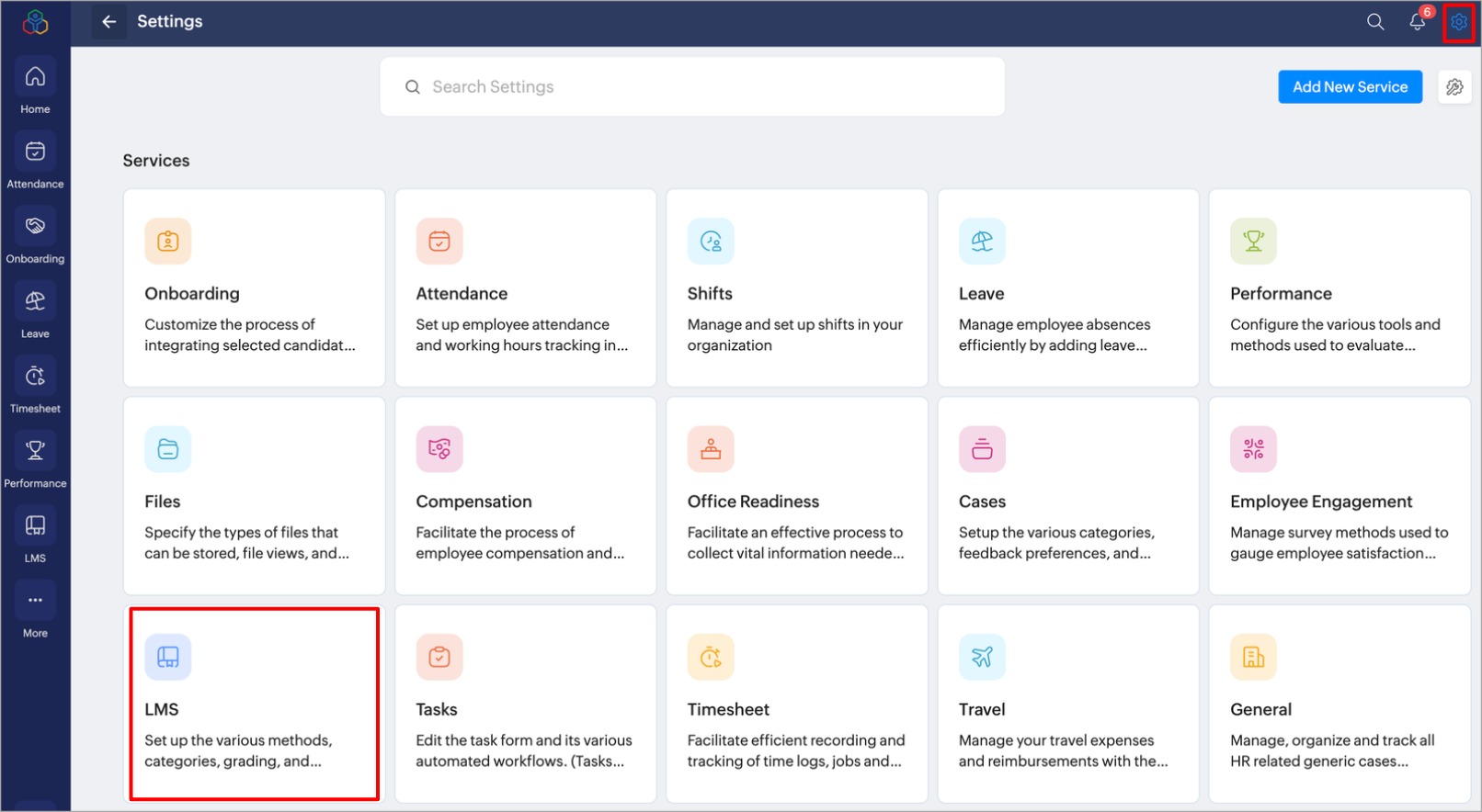 学習管理の設定にアクセスするには、画面右上の[設定]→[LMS]の順に移動します。こちらで設定した内容は、すべてのコースに適用されます。