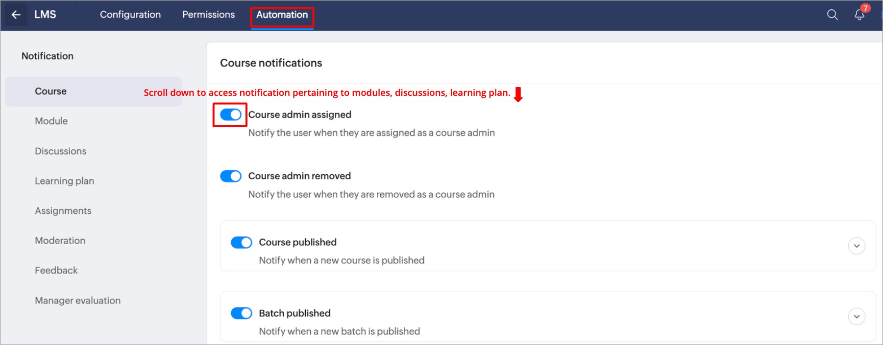 この機能を使用すると、あらかじめ設定した条件に基づいて自動的にメールを送信できます。新しいコースが公開された際や、受講者がコースを完了した際に上司に送信される通知など、設定した条件に基づいて送信される通知を有効化/無効化します。通知には、以下の4種類があります。