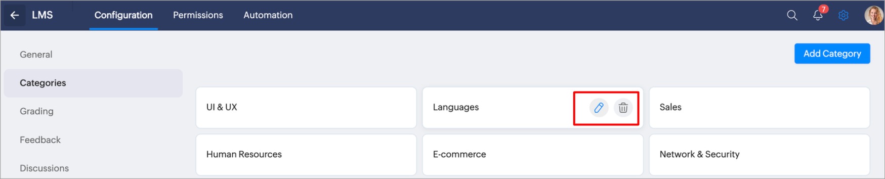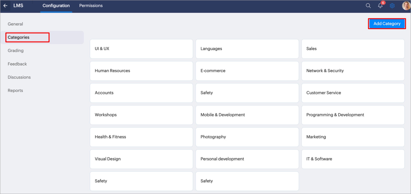 コースは、さまざまなカテゴリーに分けられます。これらのカテゴリーは、組織のニーズに基づいて作成できます。標準で用意されているカテゴリーには、「一般」、「人事」、「営業」などがあります。必要に応じて、これらを編集/削除できます。
