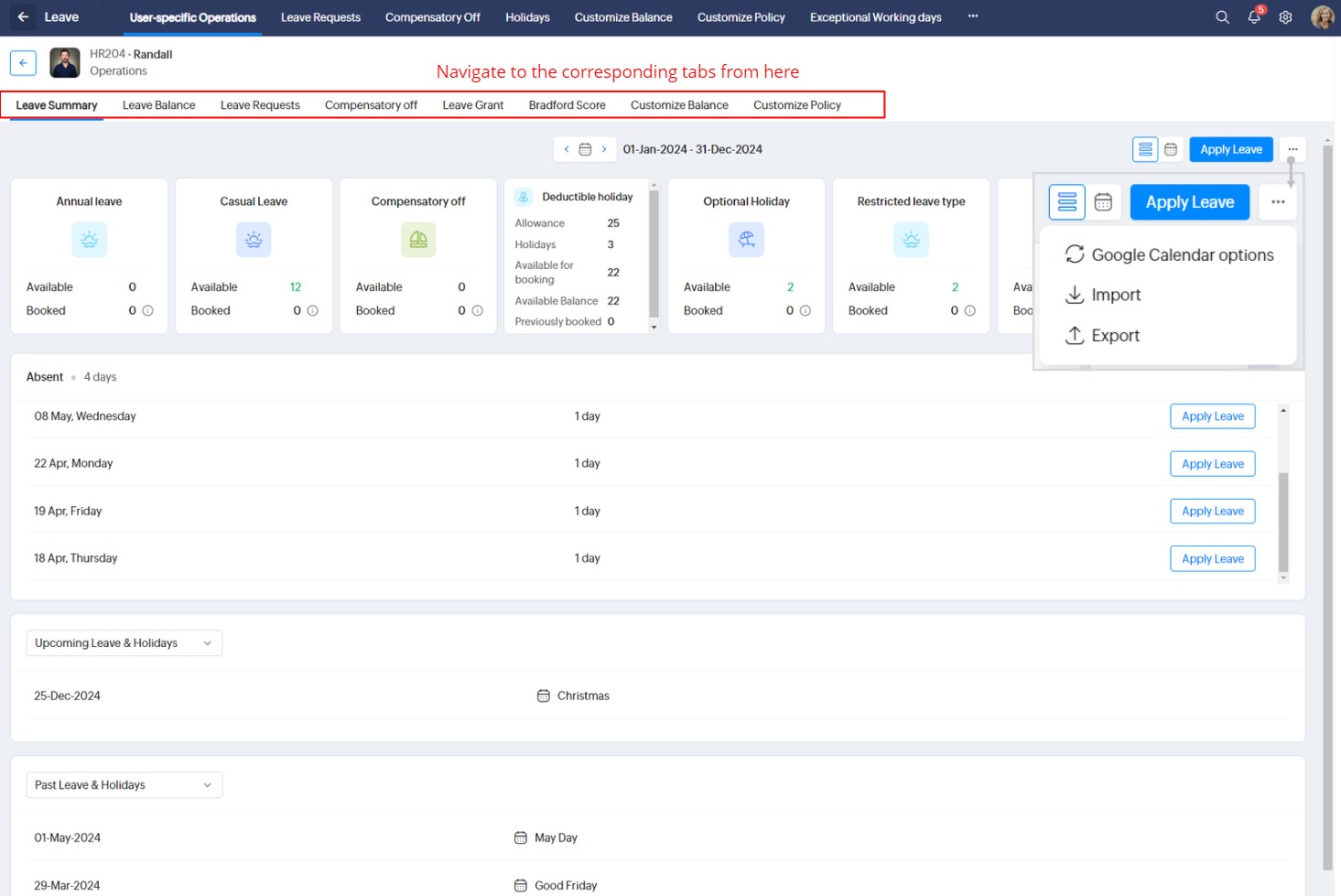 2. 従業員に関するすべての休暇申請の表示/管理(振替休日および休暇の個別申請を含む)