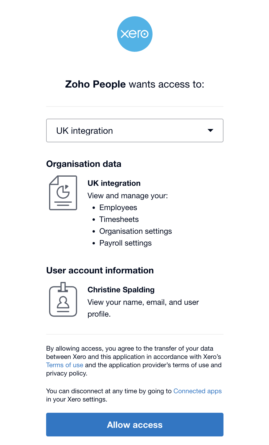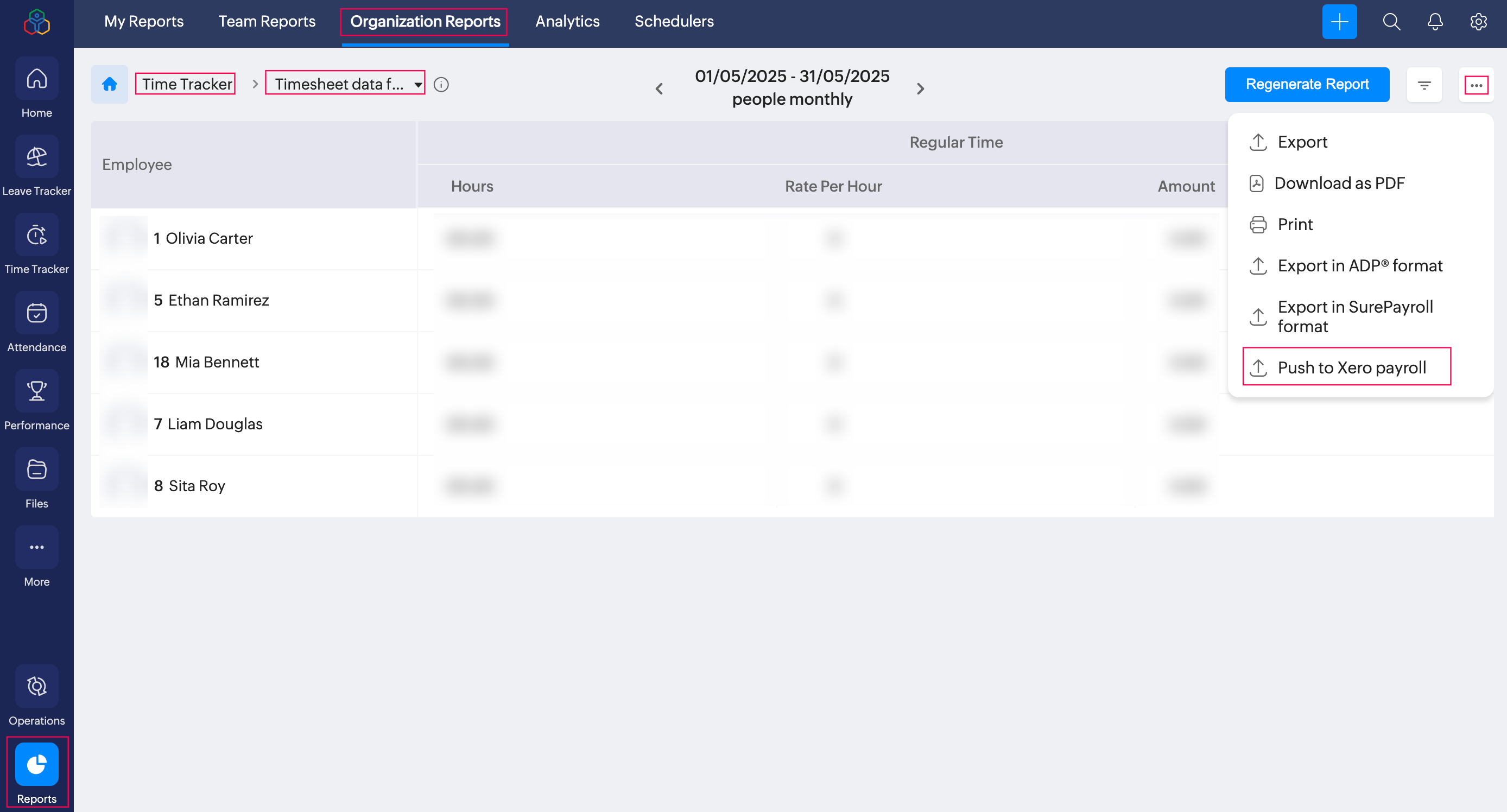 Zoho Peopleから Xero Payrollに工数表のデータを送信するには、次の手順を実行します。