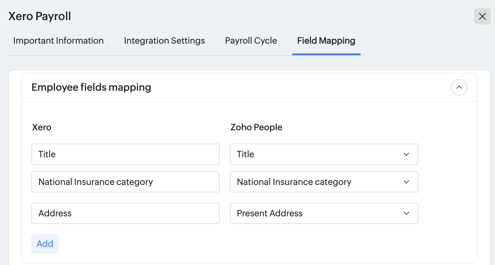 1. 必須の項目(職位、NIC(国民保険区分)、住所、給与プロセスなど)を、Zoho PeopleとXero Payroll間で関連付けます。