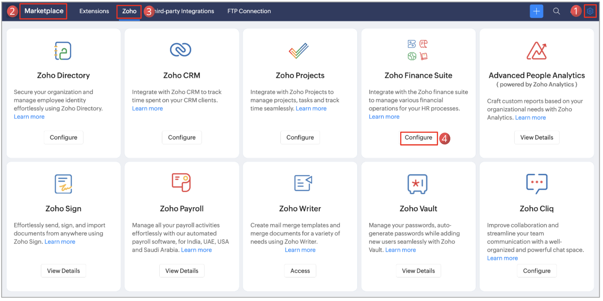 1. [設定]→[マーケットプレイス]→[Zoho]→[Zoho Finance Suite]→[詳細を表示する]→[Zoho Books]の順に移動します。