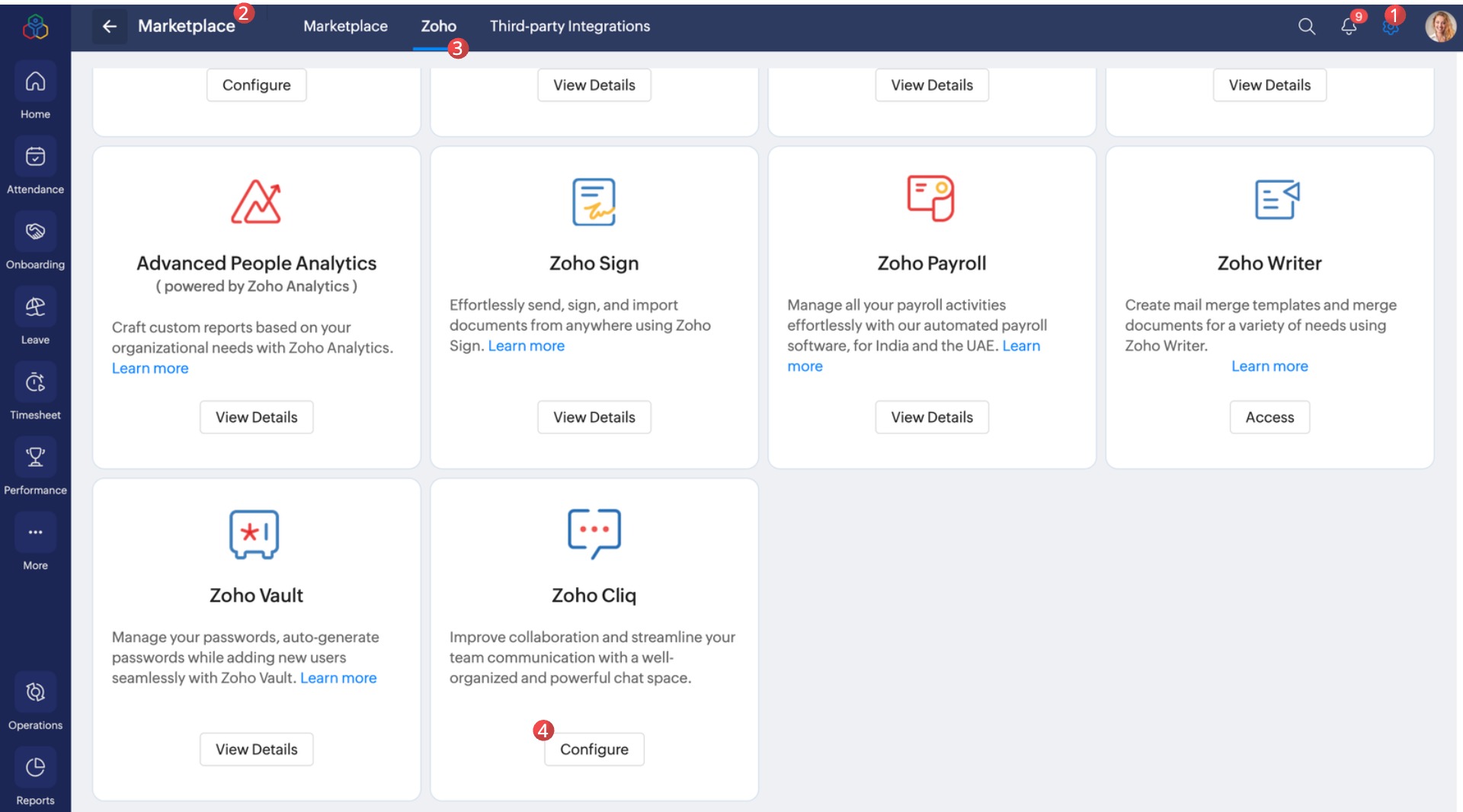 Zoho PeopleとZoho Cliqの両方であなたのZoho取引先にログインしていることを確認し、以下の手順に従ってください: