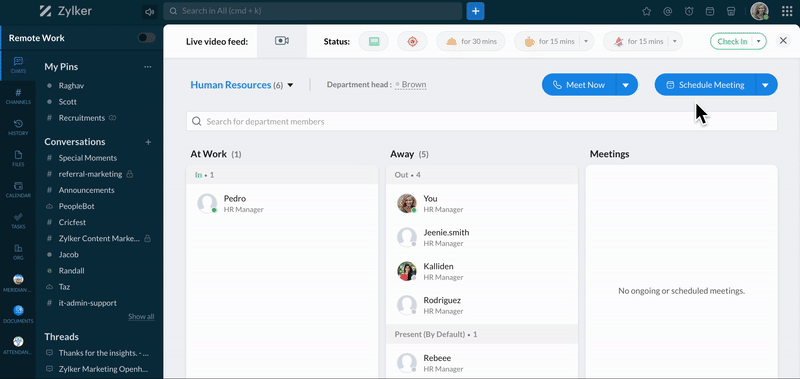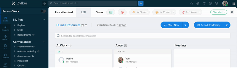 従業員はZoho Cliqから直接チェックインおよびチェックアウトが可能です。