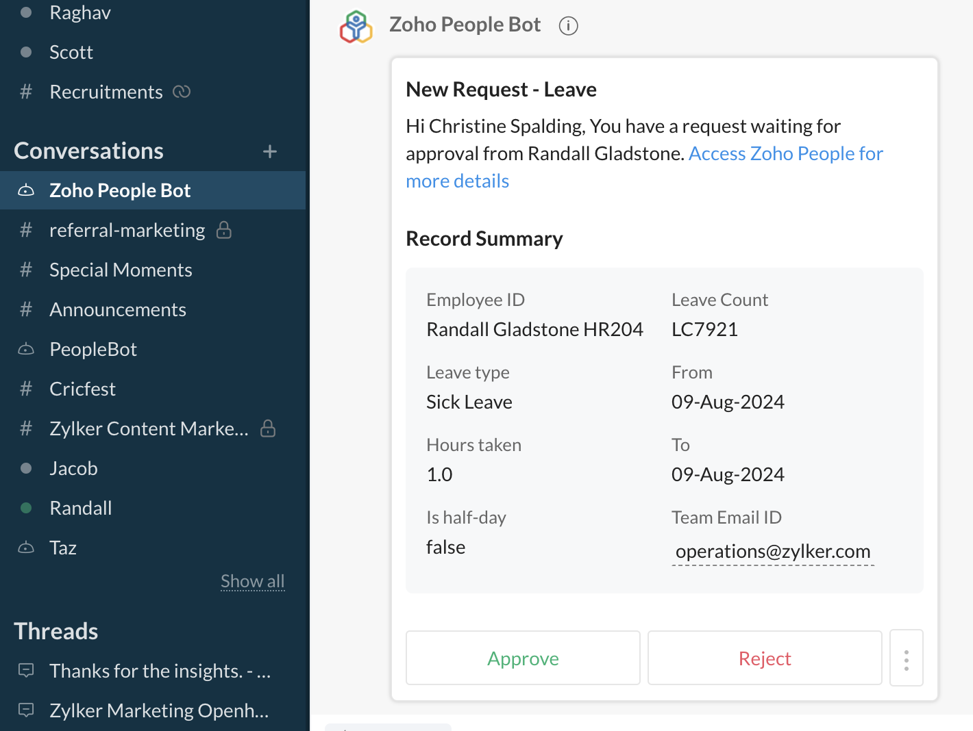 マネージャーはZoho Peopleボットを介してZoho Cliqで通知を取得します。通知にアクセスすると、マネージャーは承認、却下、転送(該当する場合)を行うことができます。'Access Zoho People for more details'をクリックすると、マネージャーはZoho People内のリクエストデータにアクセスできます。