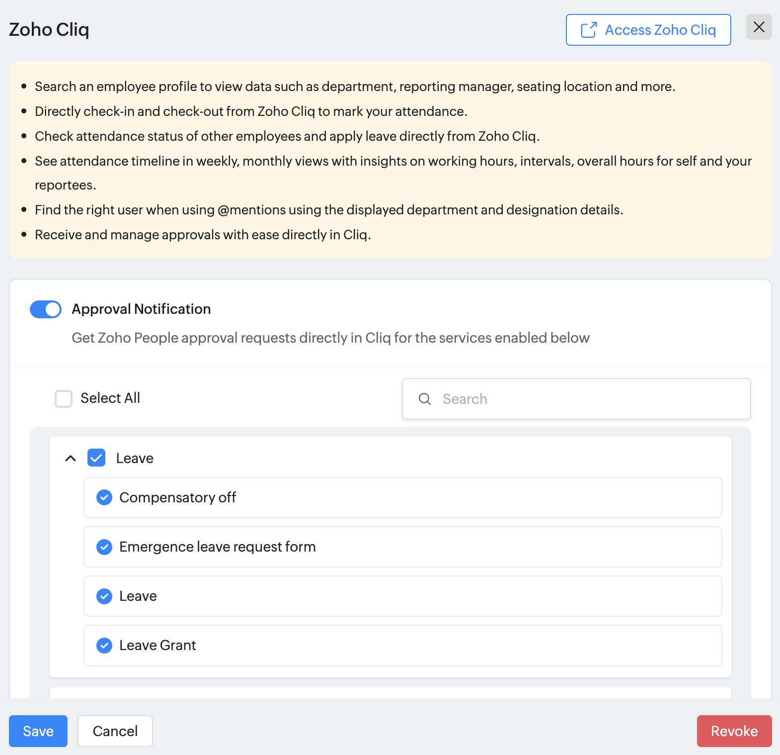 マネージャーは、Zoho Cliqで直接承認や却下を行うことができます。関連するサービスとフォームで承認を有効にして、Zoho Cliqで直接承認通知を受け取るようにしてください。初めて承認を行う時はアクセスを許可する必要があります。