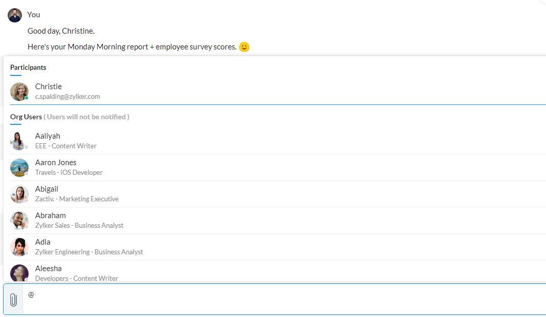 Cliqチャット内で@メンション使用時に、役職や部署情報をZoho Peopleから取得し表示することで、共通の名前を持つ人物でも正しい人物に容易に連絡できます。