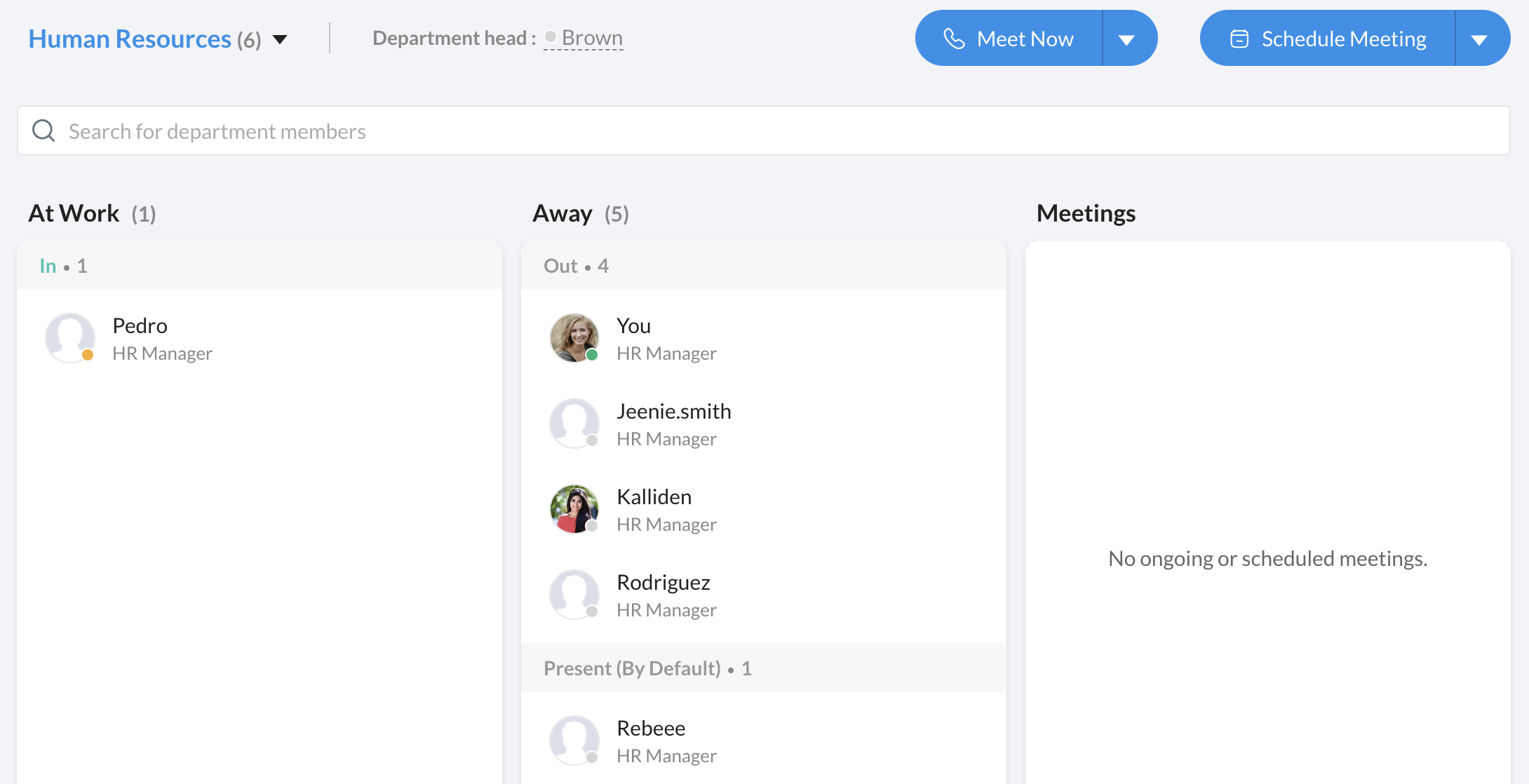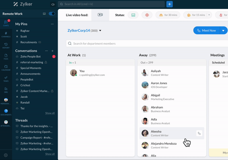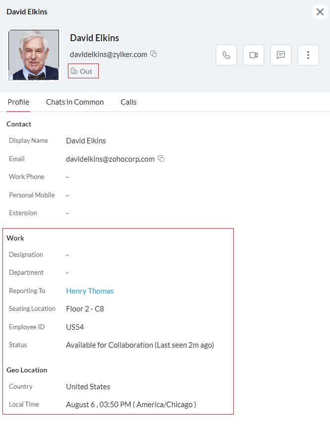 Zoho Cliqで、所属部署、席の場所、ステータスなど、従業員のデータを直接検索し表示できます