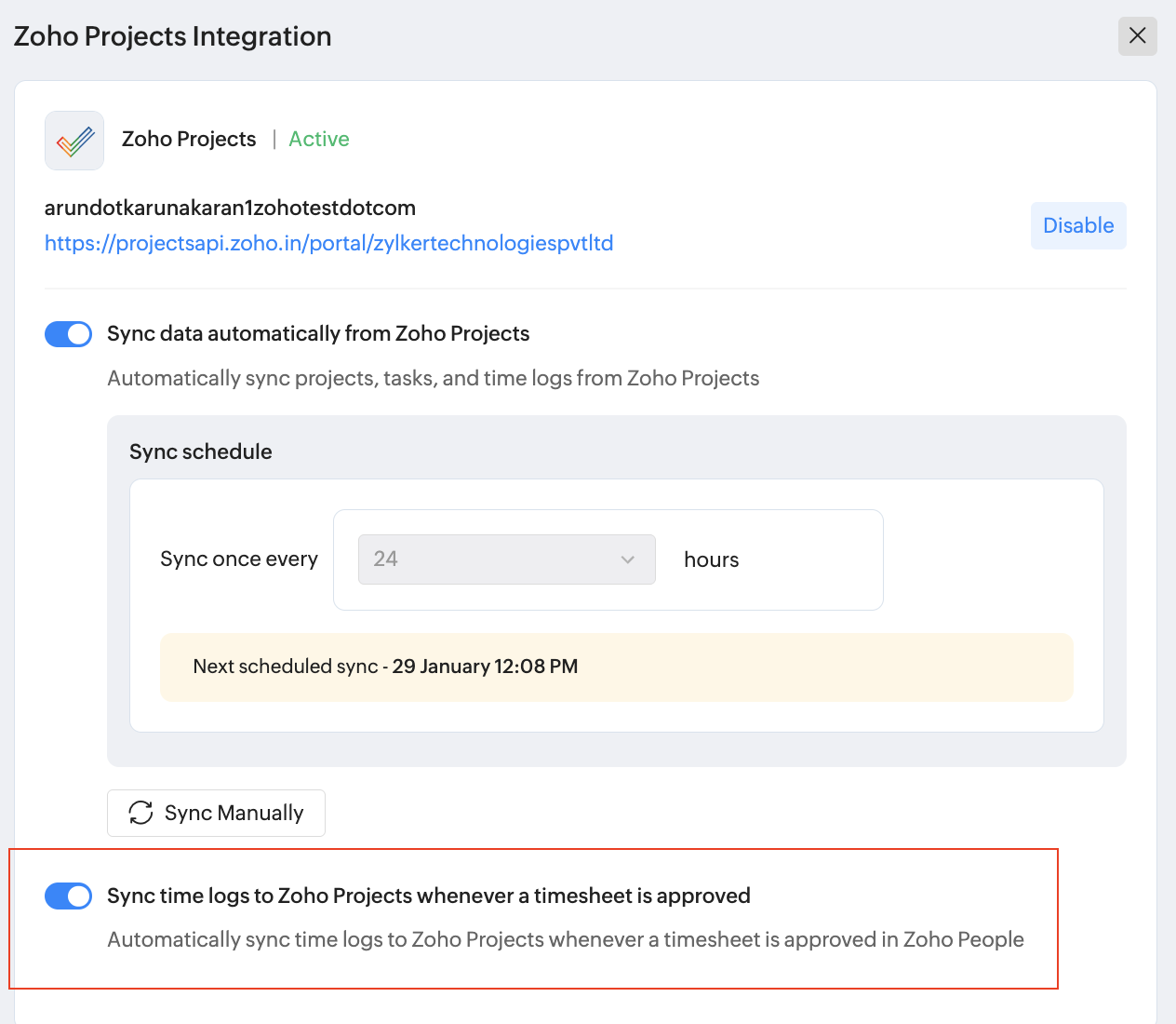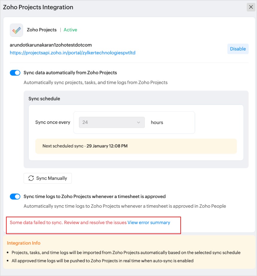 Zoho Projectsからプロジェクト、タスク、工数の記録をインポートする際や、承認済みの工数をZoho Projectsに送信する際にエラーが発生した場合、同期エラーの概要を表示する機能を利用して同期のエラーを確認し、解決できます。