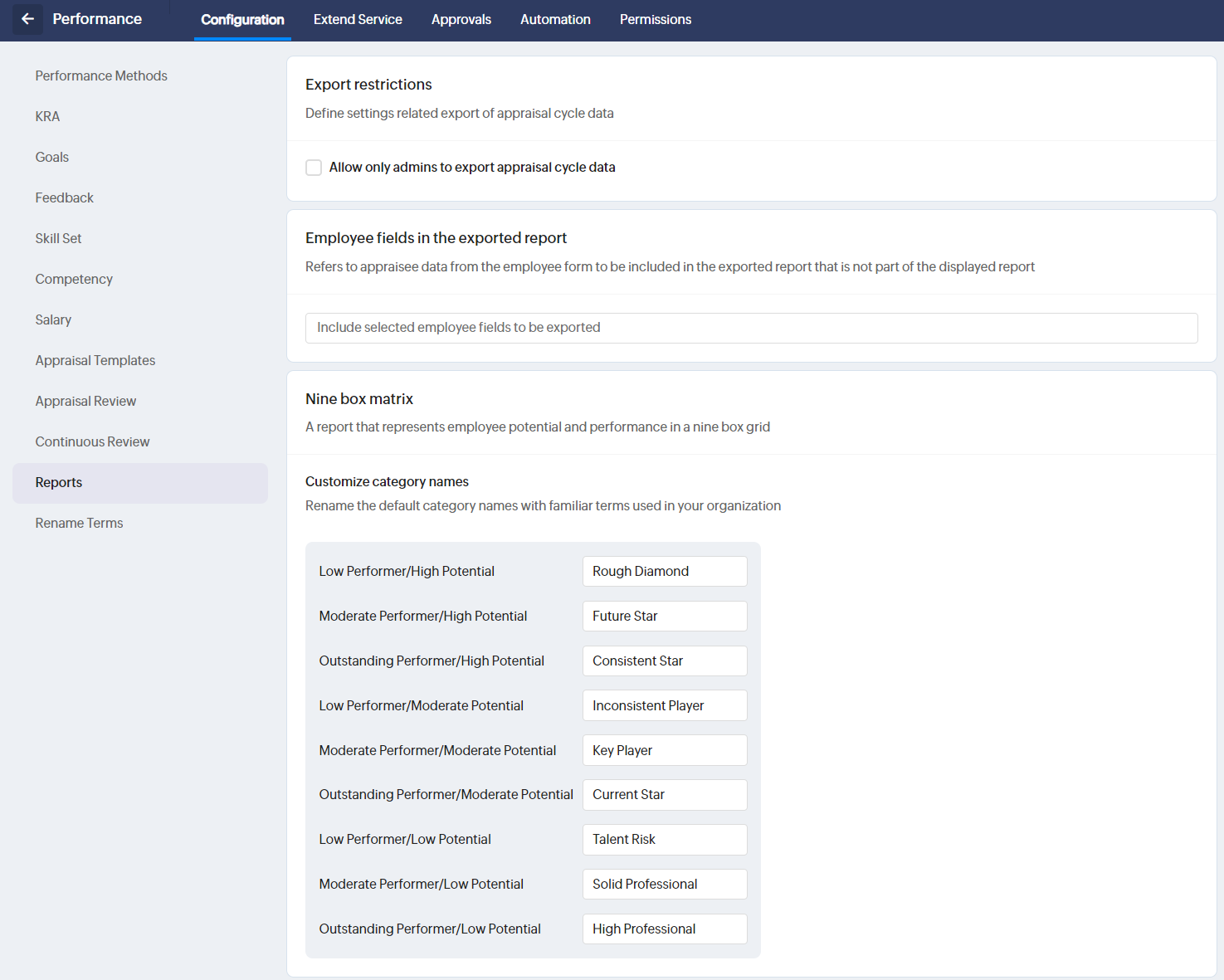 この画面では、評価プロセスのデータをエクスポートする権限を管理者のみに付与したり、エクスポートするレポートに含まれる項目を設定したり、[3×3マトリクス表]に入れるカテゴリー名をカスタマイズしたりすることができます。