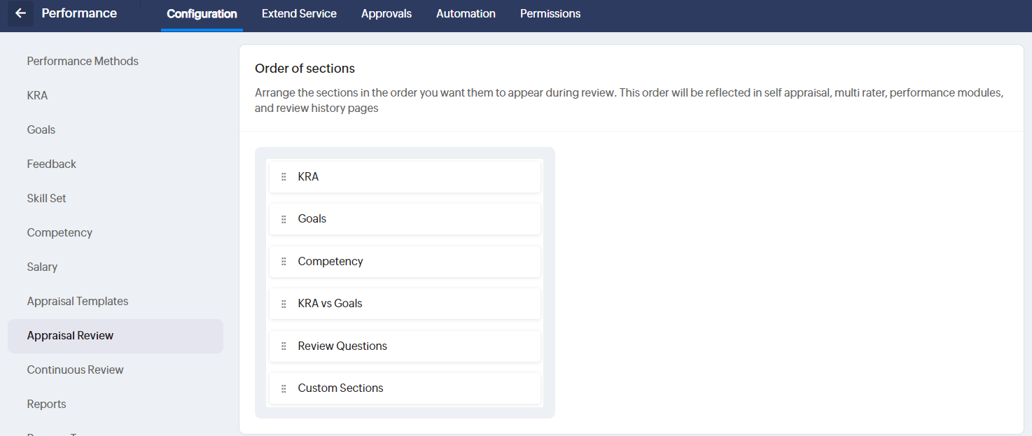 評価の際に表示するセクションの順番を並び替えることができます。この順番は、自己評価、多面的評価、[評価]タブ、評価履歴ページに反映されます。