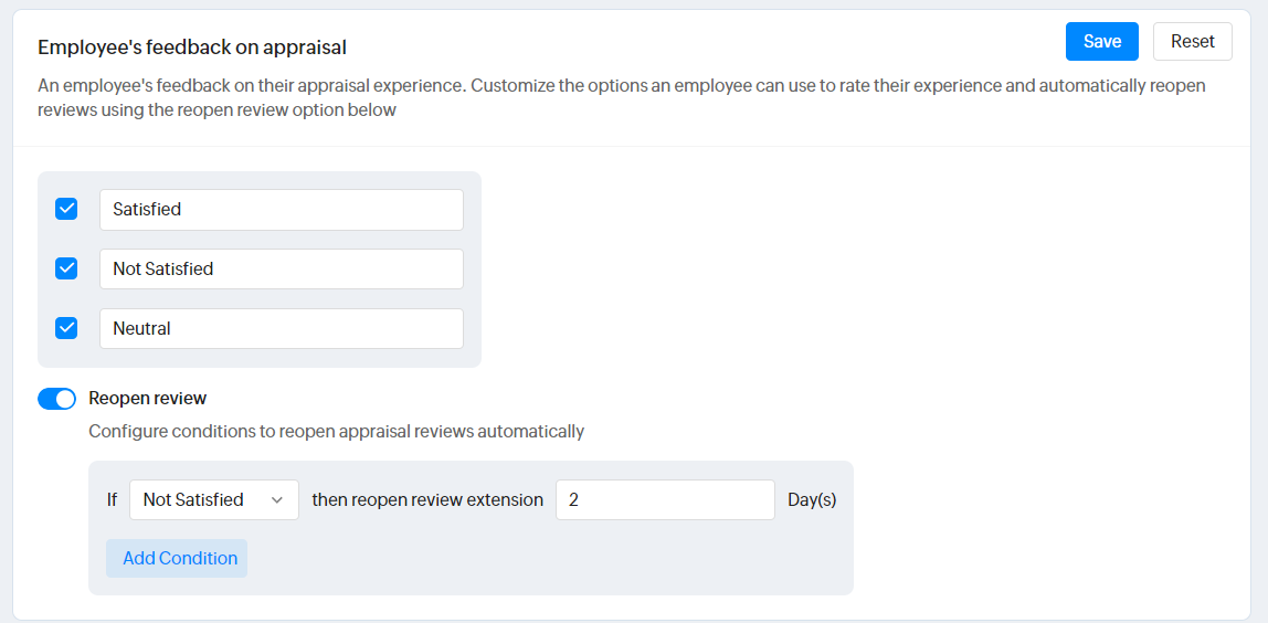 従業員のフィードバックに関する設定をカスタマイズできます。また、指定した条件に合うフィードバックを受け取った場合、指定した日数分だけ評価を自動で再開する設定も可能です。