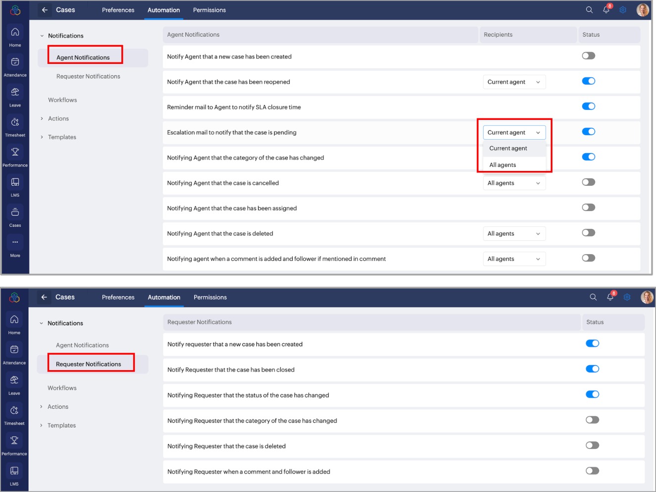 [受信者]のドロップダウンを使用すると、[現在の担当者]または、問い合わせに関連する[すべての担当者]から通知先を選択できます。