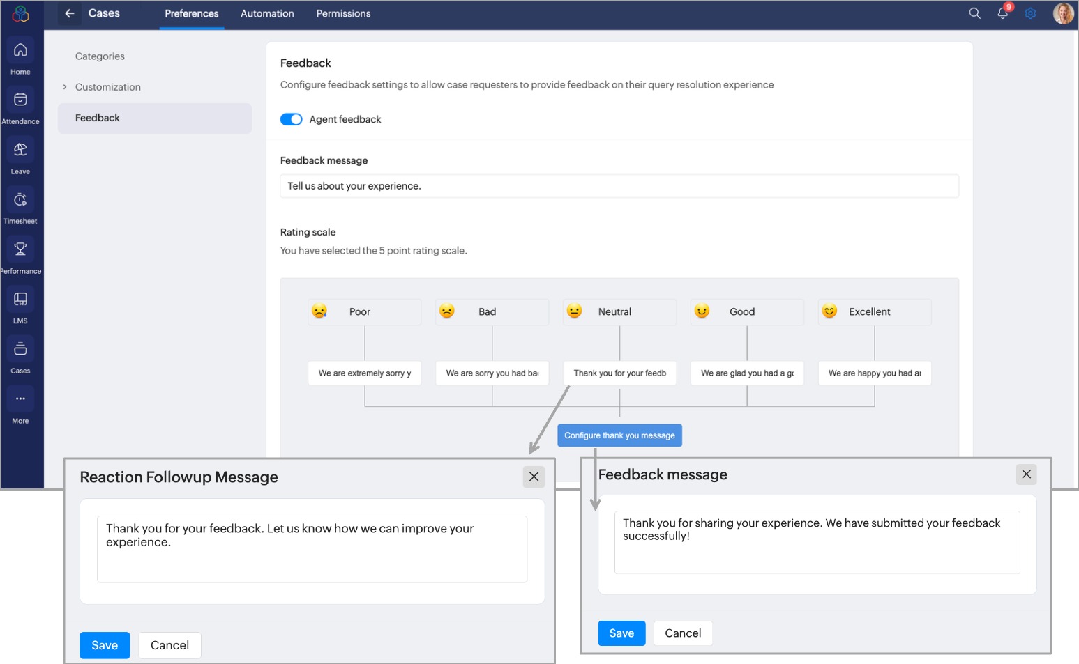 5. 必要に応じて、フィードバックに対する反応のフォローアップのメッセージとお礼メッセージを設定します。