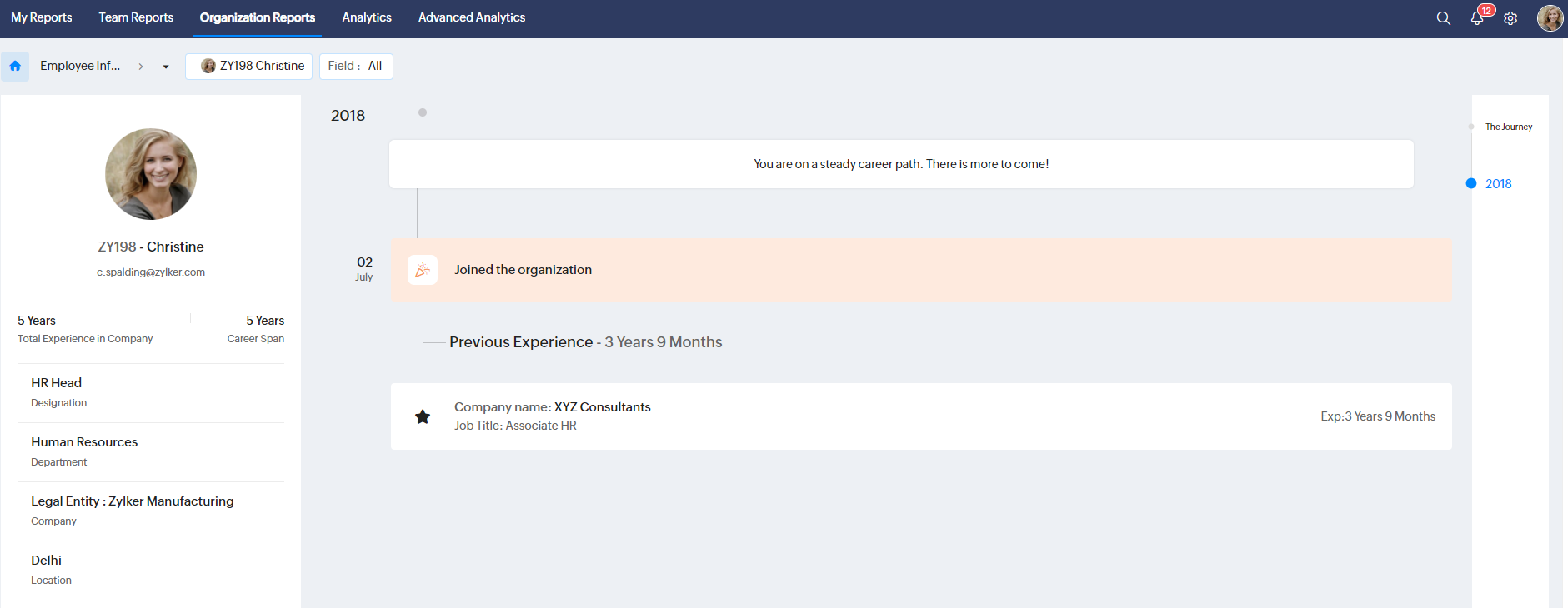 このレポートでは、従業員の職務経験に関する情報を確認できます。レポートには、現在の組織での経験、役職の変更、以前の会社での経歴の詳細が含まれ、この情報を視覚化したタイムラインが表示されます。キャリアの履歴は、 [自分のスペース]→[キャリアの履歴]タブでも確認できます。ドロップダウンを使用すると、他の従業員のキャリアの履歴を表示できます。このレポートを活用すると、管理職が昇給や昇進を検討する際に、従業員の経験をかんたんに把握することが可能です。