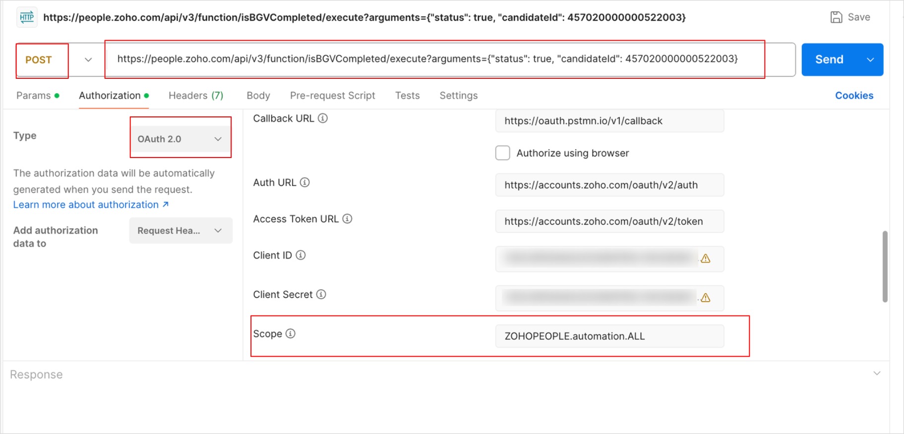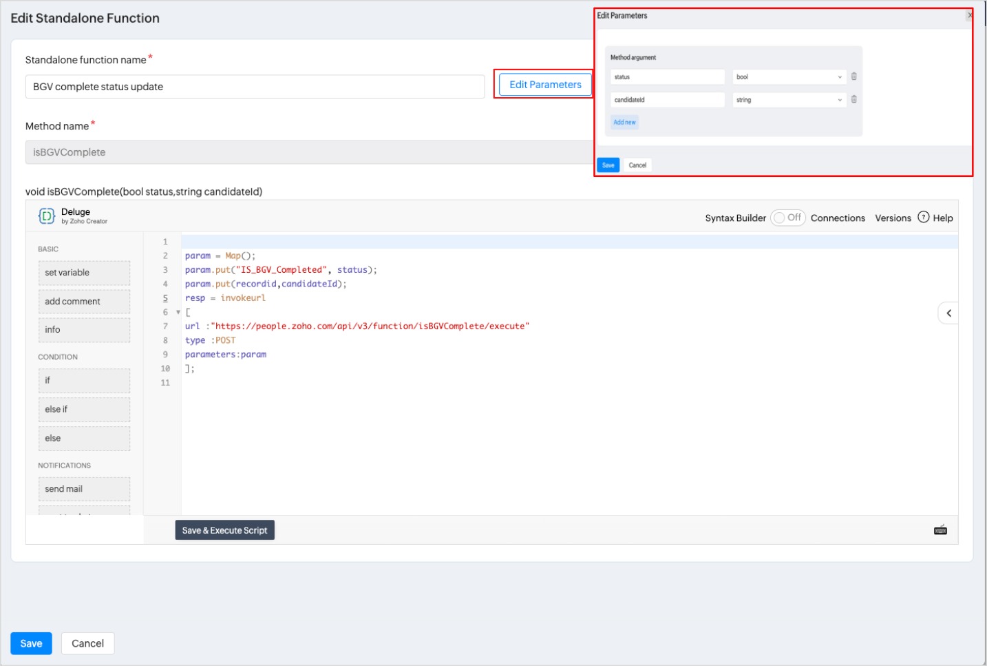 Zoho People API を使用して、外部アプリケーションやシステムからスタンドアロン関数を呼び出します。API の詳細は、スタンドアロン関数呼び出しAPIをご参照ください。