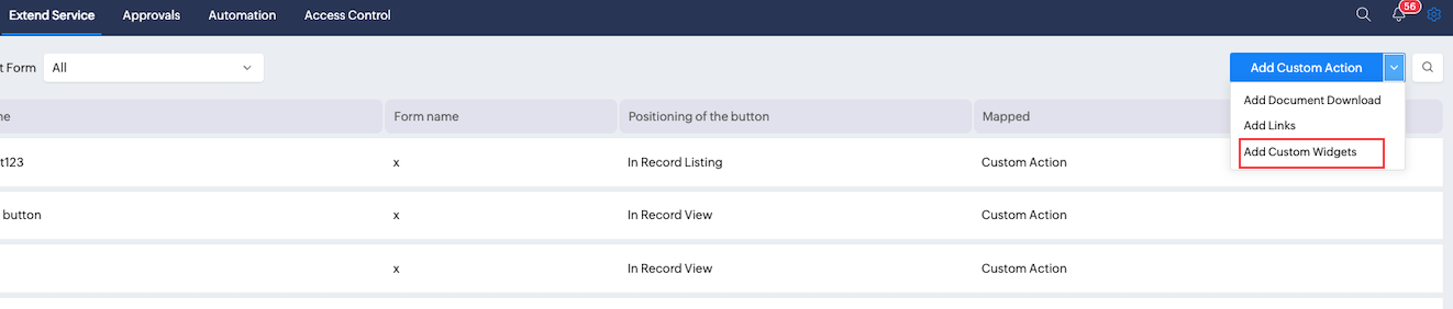 10. カスタムボタンウィジェットを表示し使用するには、Operations > すべて表示 > サービス > 関連フォームに移動し、データを選択するかクリックしてカスタムボタンウィジェットを表示します。