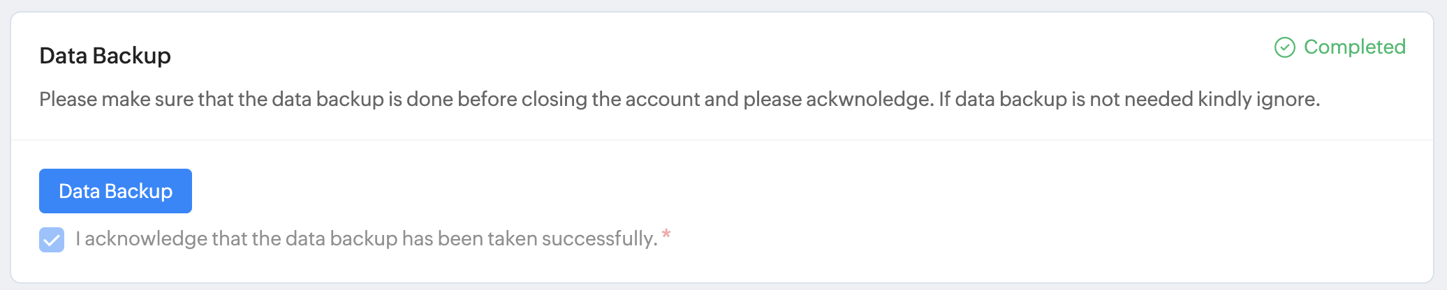 6. ウィザードの最初のステップは、アカウントデータのバックアップです。[データのバックアップ]をクリックして、バックアップを取得します。バックアップが不要な場合、またはバックアップをすでに保存している場合は、このステップを完了したものとしてチェックボックスにチェックを入れます。チェックボックスをクリックすると、確認画面が表示されるので、[確定する]をクリックします。これで、このステップは完了です。