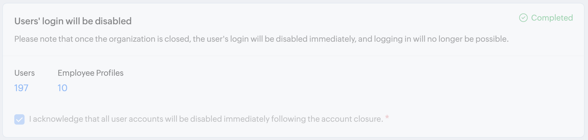 2. ウィザードの3番目のステップは、Zoho Peopleを現在利用している従業員についての確認です。組織を削除すると、Zoho Peopleのユーザーアカウントは即時に無効になります。このため、組織を削除した直後から、従業員はZoho Peopleに一切サインインできなくなります。ウィザードの画面に表示されている内容を確認して、チェックボックスにチェックを入れると、このステップは完了になります(実際にユーザーアカウントが無効になるのは、ウィザードの最後のステップが完了した後です)。