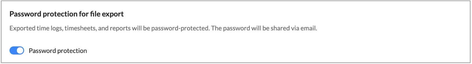 この機能を有効にすると、工数の記録、工数表、レポートなど、エクスポートされたすべてのファイルにパスワードを追加できます。パスワードは、ファイルをエクスポートしたユーザーにメールで送信されます。