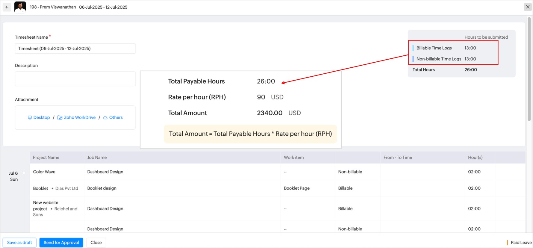 給与のレポート用の工数表のデータと、工数表の支払い対象時間の計算に、請求対象外の時間を含める:この機能を有効にすると、給与のレポート用の工数表データおよび工数表提出時の総支払対象時間数に、請求対象外の工数を追加することができます。