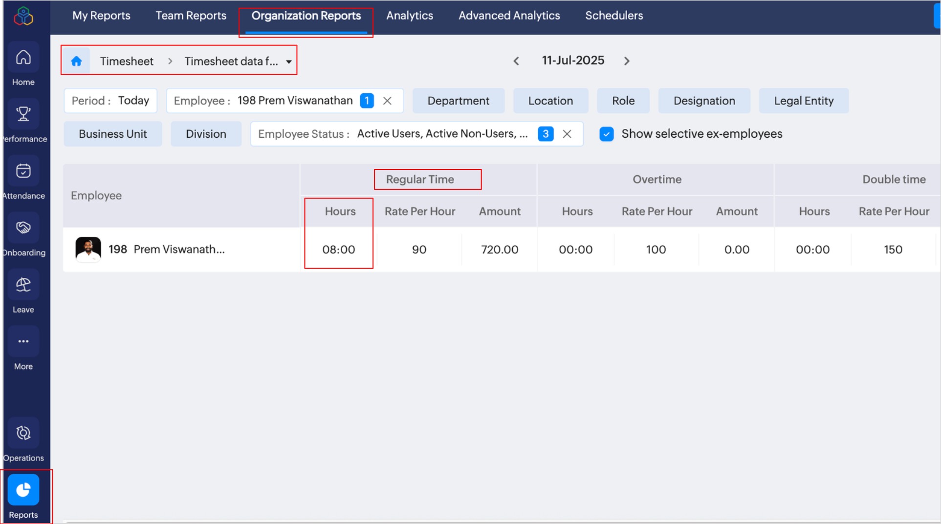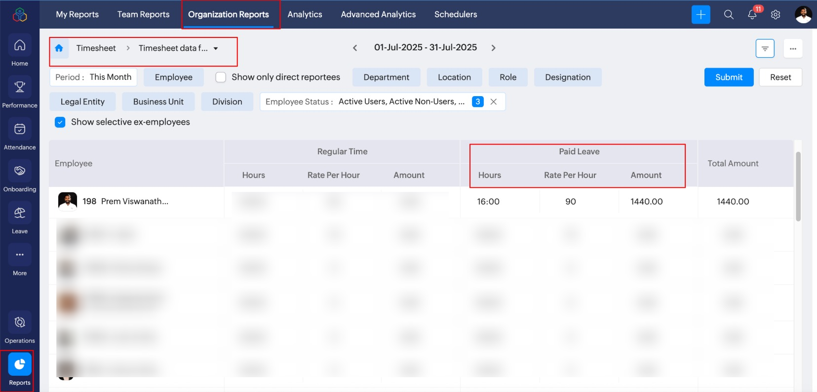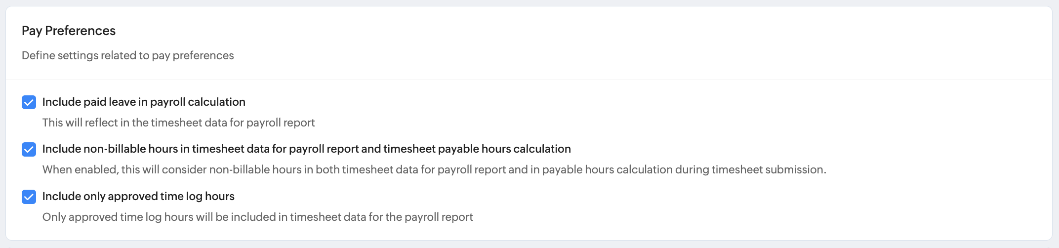 給与の計算時に有給休暇を含める:この機能を有効にすると、すべての有給休暇の時間数または日数が給与のレポート用の工数表データに追加されます。