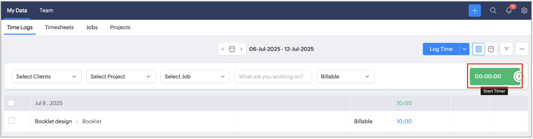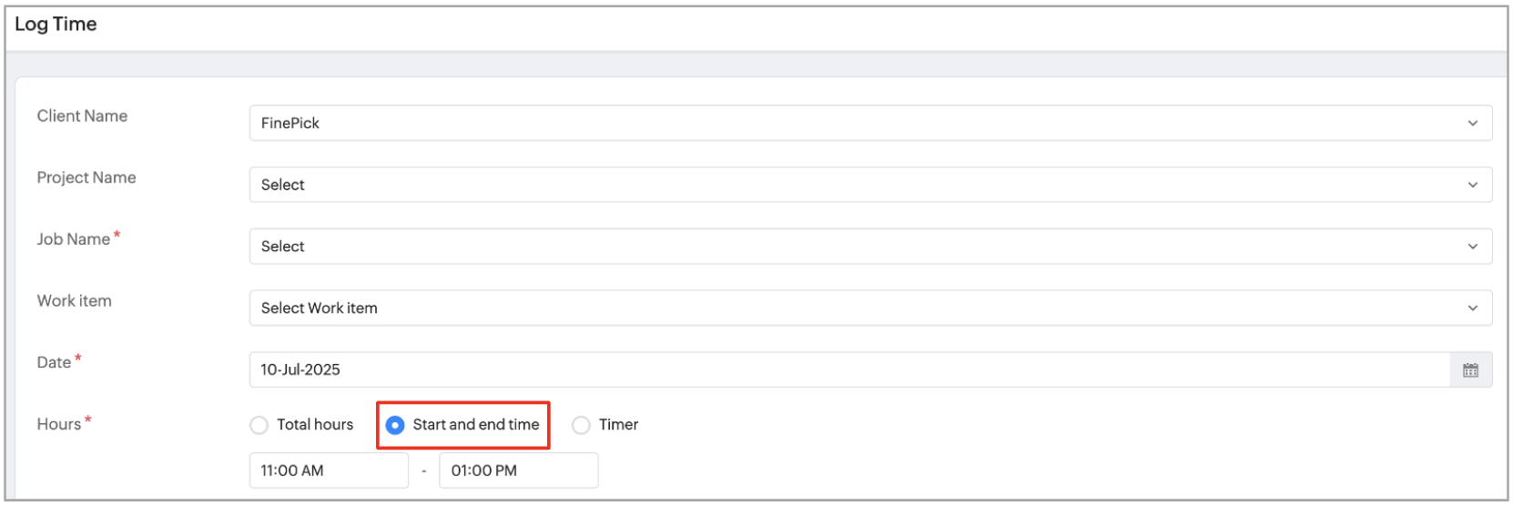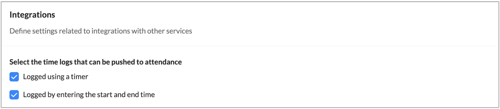 タイマーを使用して記録:この機能を選択すると、タイマーベースの工数の記録を出退勤機能に送信できます。従業員が勤務時間を管理するためにタイマーを開始/停止すると、そのデータは自動的に出退勤データに反映されます。