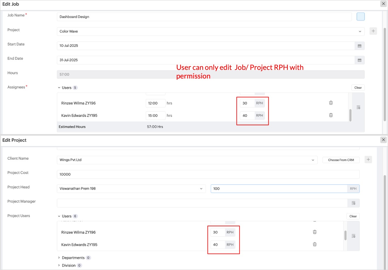 1. 同じ業務またはプロジェクトに所属する従業員のみが、お互いの時間単価を表示、編集できます